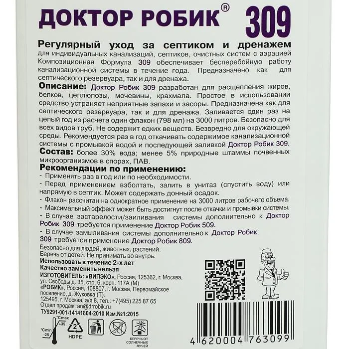 Безопасно для всех видов труб. Не содержит едких веществ. Безвредно для окружающей среды. Рекомендуется раз в год откачивать содержимое канализационной системы с промывкой водой и последующей заливкой Доктор Робик 309. Безопасно для людей, животных, растений. Беречь от детей. Не принимать вовнутрь.