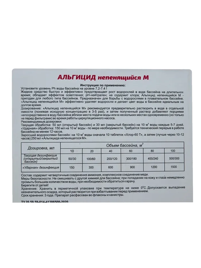 Средство предназначено против роста водорослей в воде бассейна. Эффективно удаляет водоросли на долгое время и делает цвет воды в бассейне идеальным, рН нейтрален, не содержит хлора и тяжёлых металлов, с пониженным пенообразованием. Не рекомендуется использовать в бассейнах с противотоками, фонтанами, гейзерами и в спа-бассейнах. Способ применения: перед использованием произвести обратную промывку фильтра. Добавлять с помощью мерника или автоматического дозатора непосредственно в плавательный бассейн около места подачи воды или в нескольких местах по периметру (только не перед фильтрами) при работающем циркуляционном насосе.