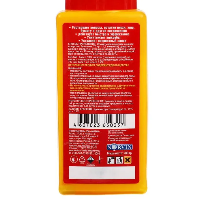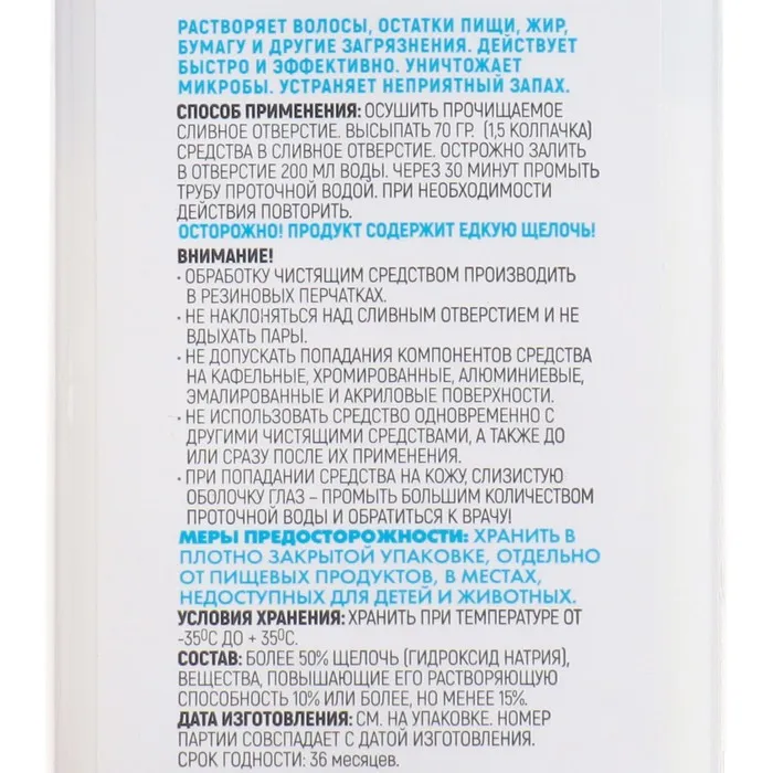 Меры предосторожности: осторожно. Содержит едкую щелочь. Использовать резиновые перчатки. Не наклонятся над сливным отверстием и не вдыхать пары. Не допускать попадания компонентов средства на кафельные, хромированные, алюминиевые, эмалированные и акриловые поверхности. Не использовать средство одновременно с другими чистящими средствами. При попадании средства на кожу, слизистую оболочку глаз – промыть большим количеством воды и обратиться к врачу. Хранить при температуре от -35 до +35С.