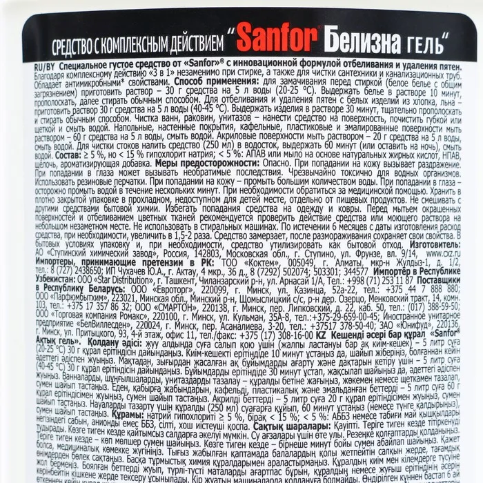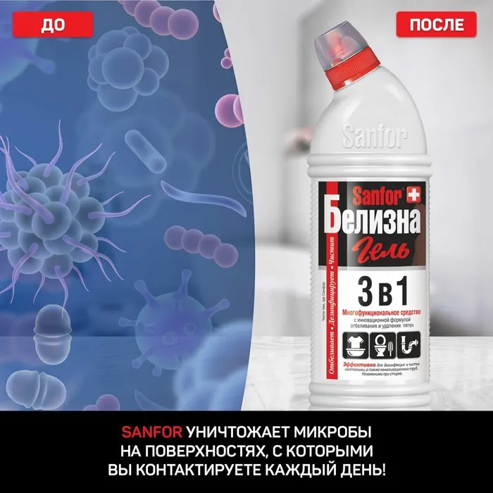 Sanfor «Белизна-гель» 3 в 1 — многофункциональное густое средство с инновационной формулой отбеливания и удаления пятен. Подходит для стирки, а также для дезинфекции и чистки сантехники и труб.