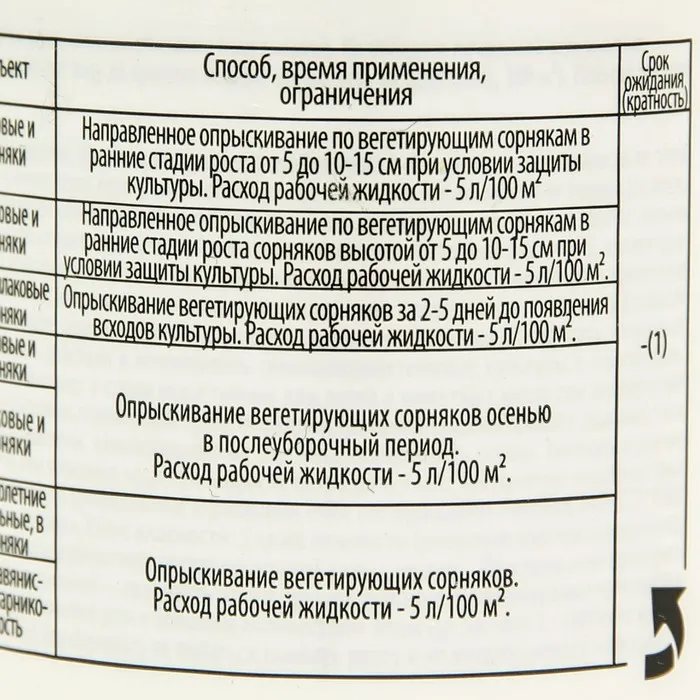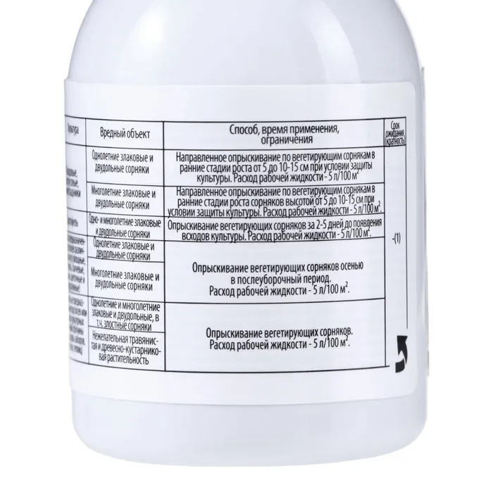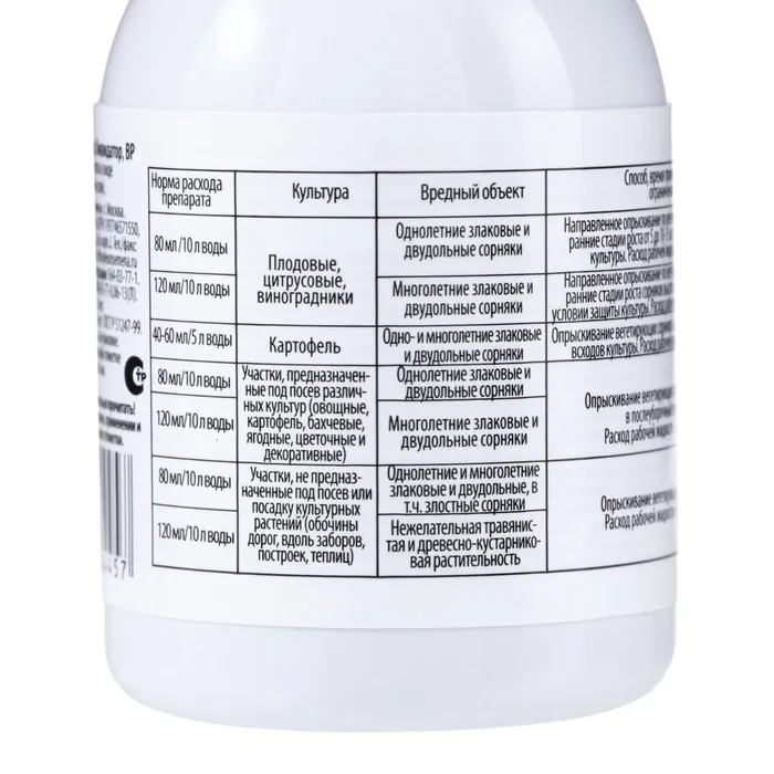 ПРИМЕНЕНИЕ/НОРМА РАСХОДА: - плодовые, цитрусовые культуры, виноградники: однолетние злаковые и двудольные сорняки: 80мл/10л воды; многолетние злаковые и двудольные сорняки:120мл/10л воды, направленное опрыскивание вегетирующих сорняков в ранние стадии роста от 5 до 10-15см при условии защиты культуры, расход - 5л/100м; - картофель: однолетние и многолетние злаковые и двудольные сорняки: 40-60мл/5л воды опрыскивание вегетирующих сорняков за 2-5 дней до появления культуры, расход - 5л/100м2; - участки под посев различных культур: однолетние злаковые и двудольные сорняки: 80мл/10л воды; многолетние злаковые и двудольные сорняки: 120мл/10л воды, опрыскивание вегетирующих сорняков осенью в послеуборочный период, расход - 5л/100м.