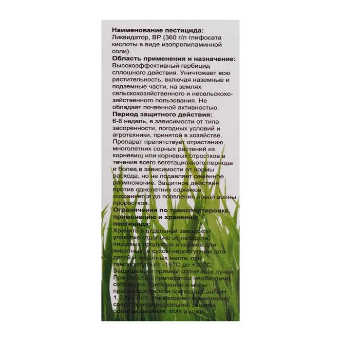 ПРЕПАРАТИВНАЯ ФОРМА: водный раствор. Просто нанесите небольшое количество жидкости на сорняк или борщевик, и уже через несколько дней вы увидите результат. Ваш сад или огород станет чистым и ухоженным, без единого сорняка! Этот продукт содержит специальный состав, который эффективно уничтожает сорняки, не повреждая при этом другие растения. Благодаря своей концентрированной формуле, Ликвидатор обладает мощным действием и гарантирует быстрый результат. Не теряйте время на прополку и борьбу с сорняками вручную - приобретите средство Ликвидатор и наслаждайтесь красивым и ухоженным садом без лишних усилий. Защитите свои растения от нежелательных гостей с помощью этого эффективного средства!