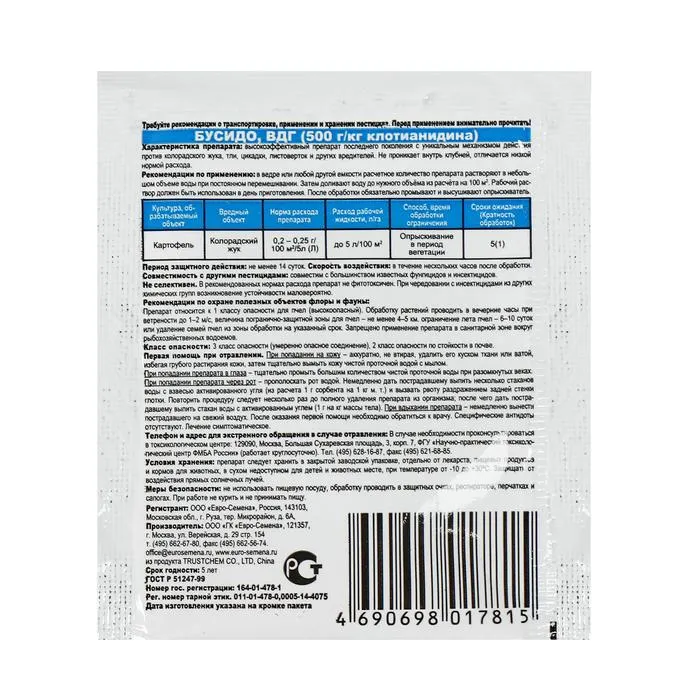 Для борьбы с колорадским жуком используйте средства 0,2-0,25г на 5л воды. Опрыскивайте в период вегетации. Расход - 5л/100м2.