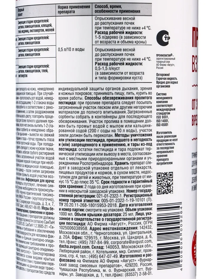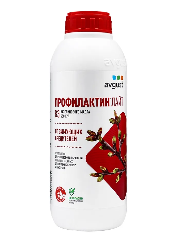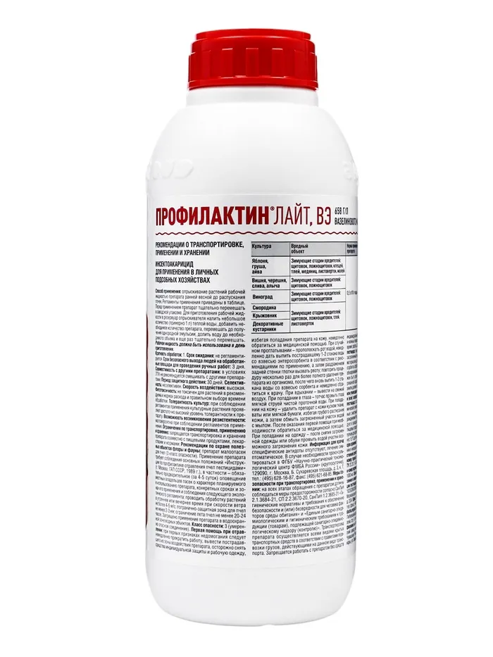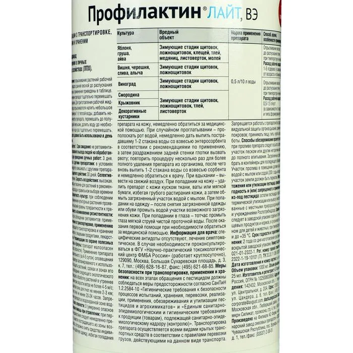 Средство защиты растений от вредителей «Профилактин Лайт» эффективно против насекомых и клещей в зимующей стадии. Является инсектоакарицидом. Допускается к использованию в личном подсобном хозяйстве, подходит для применения в экологическом земледелии. Можно обрабатывать плодовые деревья, ягодные и декоративные культуры, а также виноград.