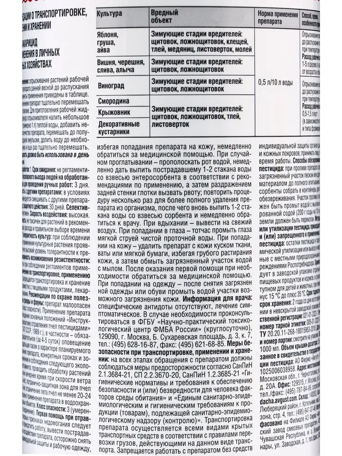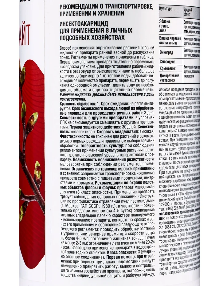 Уничтожает медяниц, тлю, листоверток, щитовок и прочих насекомых, а также клещей.