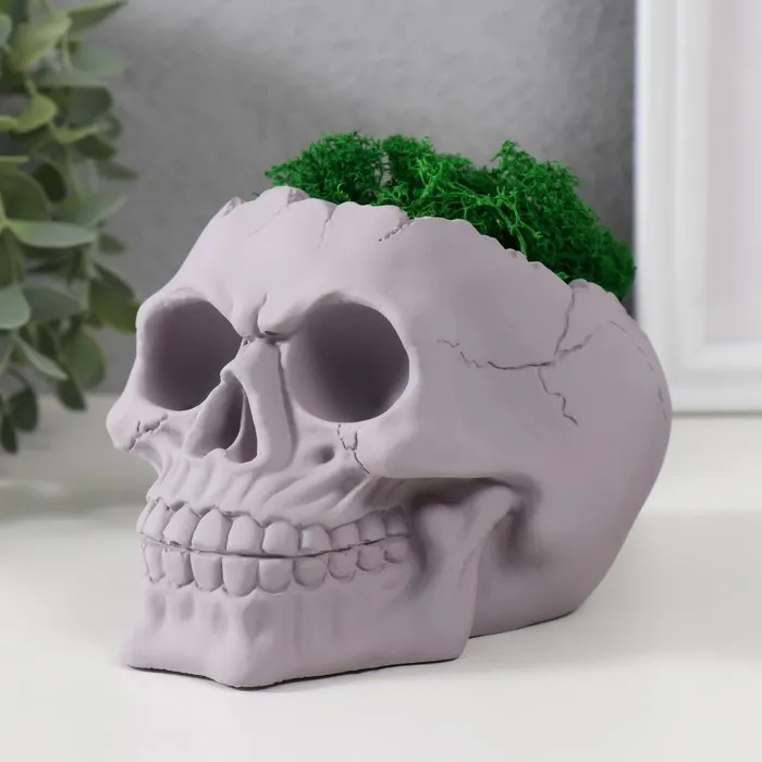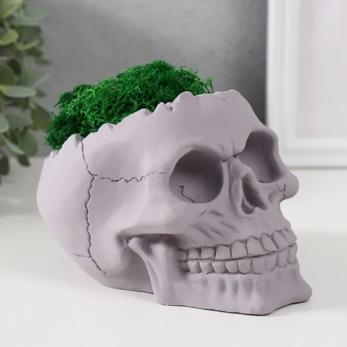 Стабилизированный мох в кашпо из бетона «Череп», 10 см, серое — Характеристики
