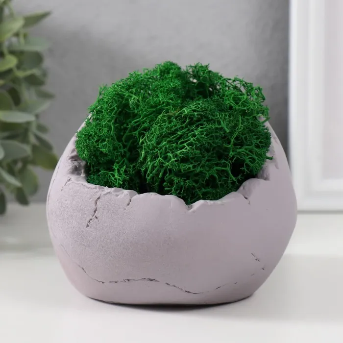 Компактный 10-сантиметровый акцент для рабочего стола или книжной полки не требует никакого ухода — стабилизированный мох сохраняет свежий вид годами без полива и солнечного света. Серый цвет подчеркивает урбанистический шарм композиции, делая её универсальным дополнением любого современного интерьера.