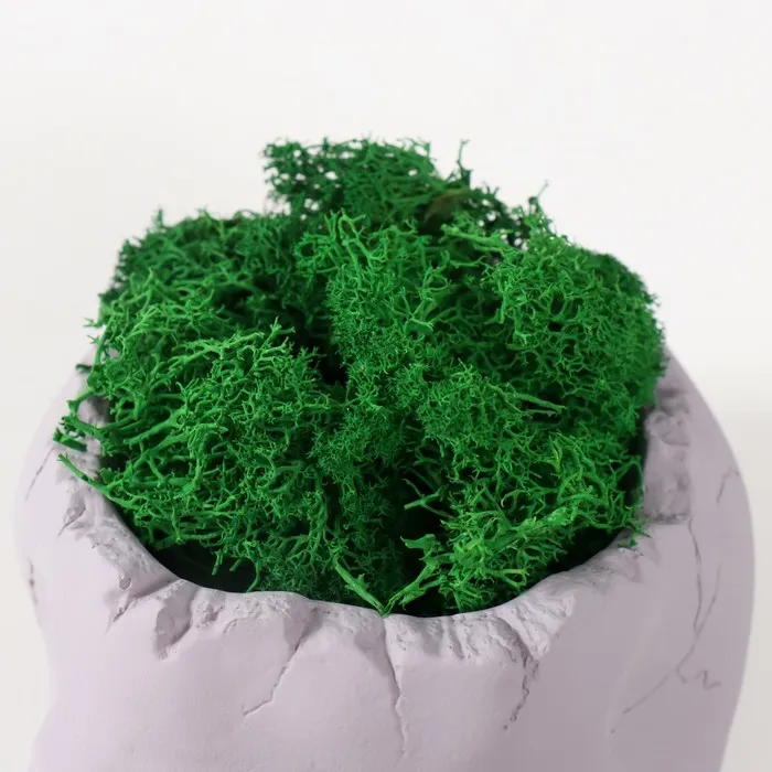 Этот необычный предмет интерьера сразу приковывает взгляд своей загадочной эстетикой. Бетонное кашпо в форме черепа с мягким ковром из стабилизированного мха создаёт эффектный контраст фактур — холодная прочность минерала и нежная бархатистость природы.