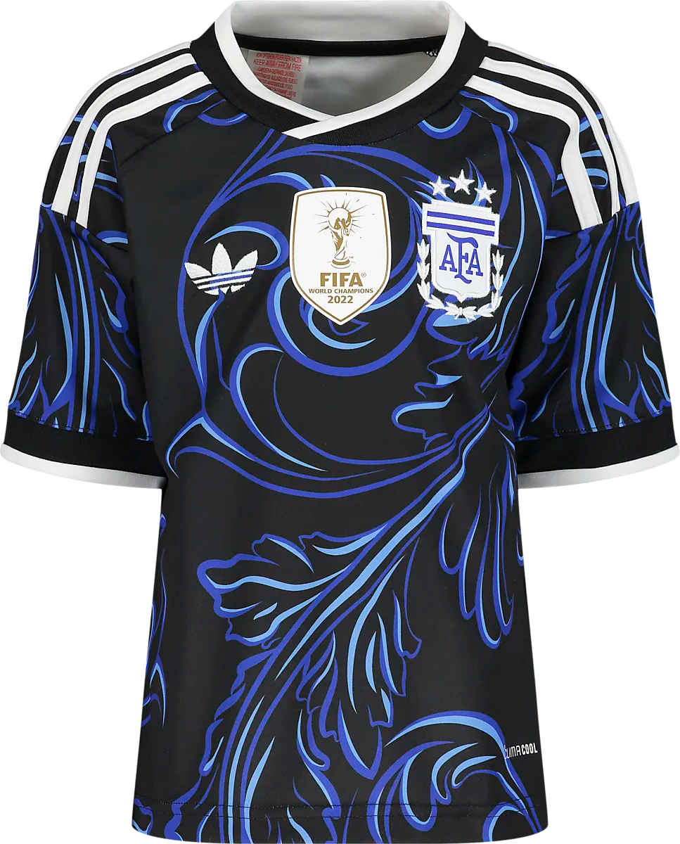 ● Футболка Аргентины 2026 года ● Детские размеры ● Ткань интерлок ● Технология КЛИМАКУЛ ● Реплика выездной футболки Аргентины 2026 года. Размеры: 128, 140, 152, 164, 176 | Цвета: Черный/Лукблю