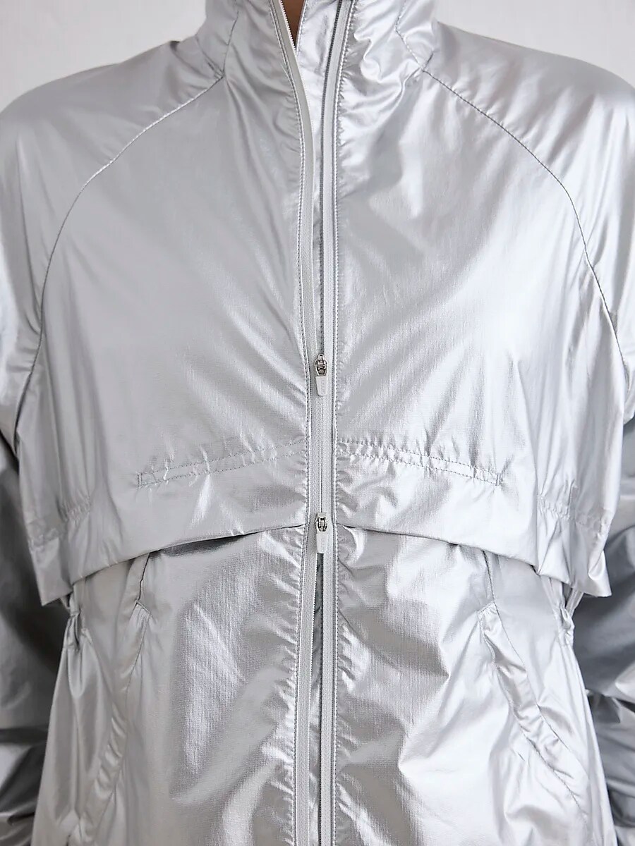 ● Беговая куртка ● Женские размеры ● Двусторонняя молния спереди. ● Регулируемый подол и талия сзади. ● Боковые карманы на молнии ● Легкий и дышащий материал. ● 100% полиамид Размеры: XS, S, M, L, XL | Цвета: Серебро