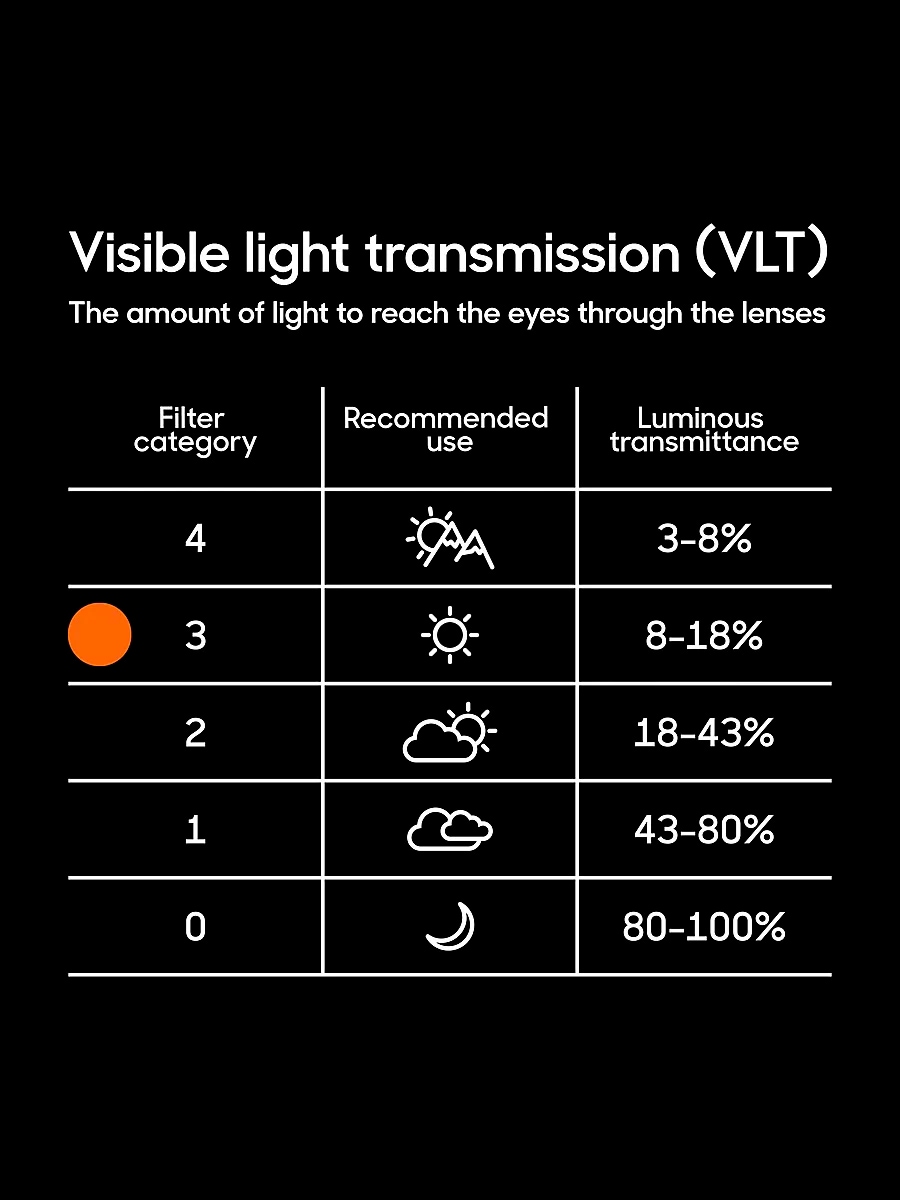 ● Объектив: Summit Vision — объектив категории 3, подходящий для солнечных дней. Линза препятствует светопропусканию на 8–18%. Объектив также имеет покрытие Revo.