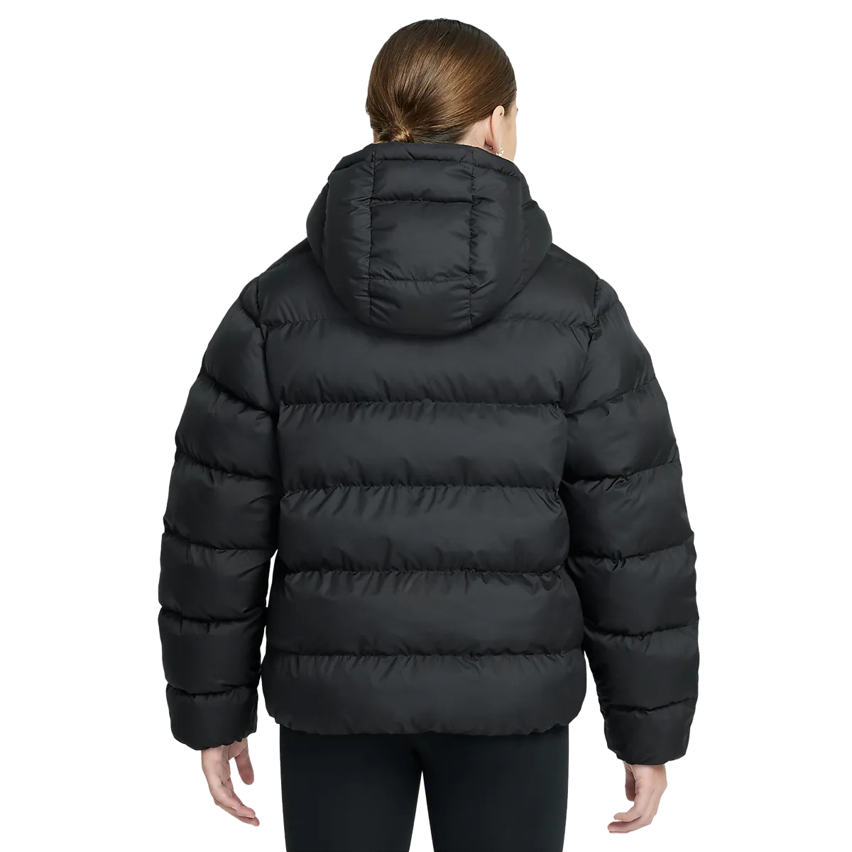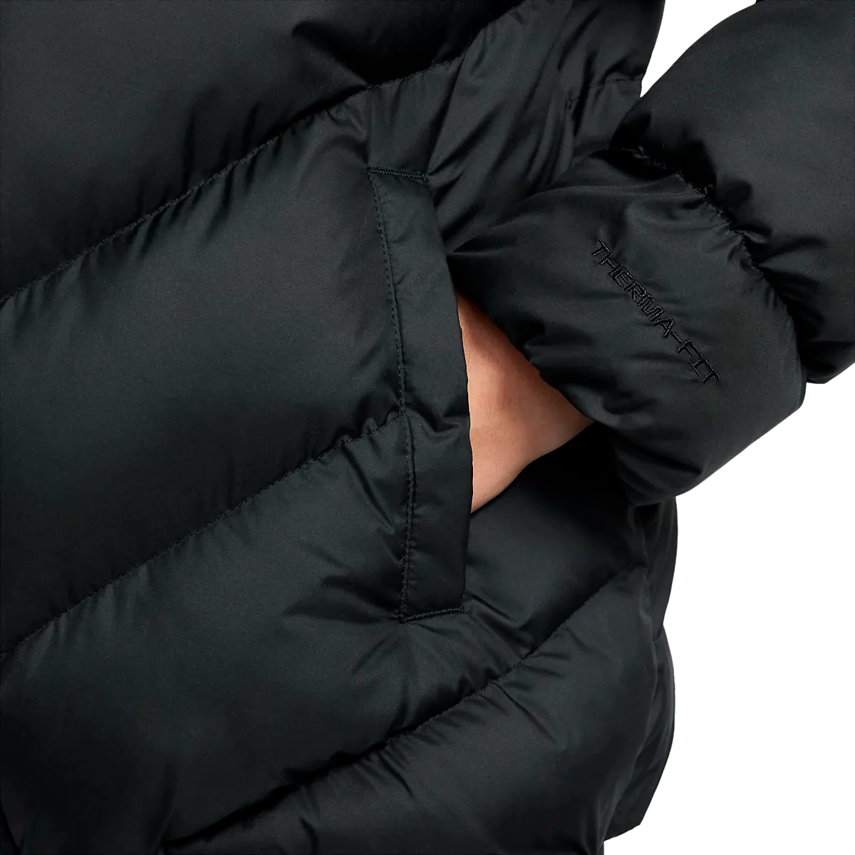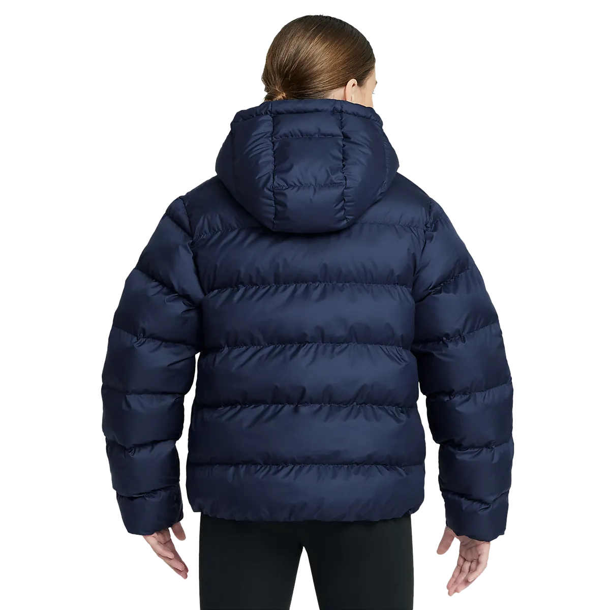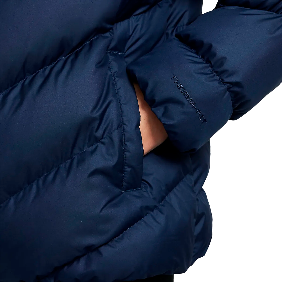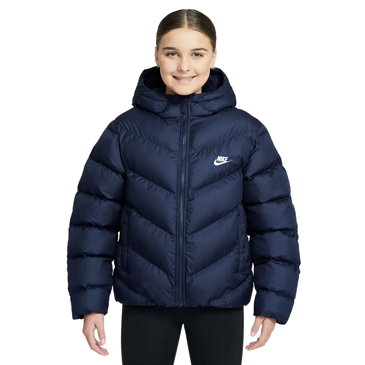 ● Стеганая куртка ● Размеры 128–170. ● Теплая синтетическая подкладка. ● Водоотталкивающий материал поверхности ● Фиксированный капюшон для дополнительной защиты. ● Боковые карманы и внутренний карман. ● Технология Nike Therma-FIT сохраняет тепло тела. ● 100% полиэстер Размеры: XL, S, L | Цвета: Черный/белый, Полуночный флот