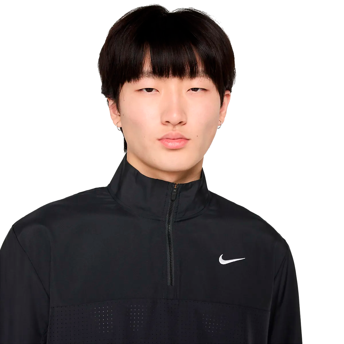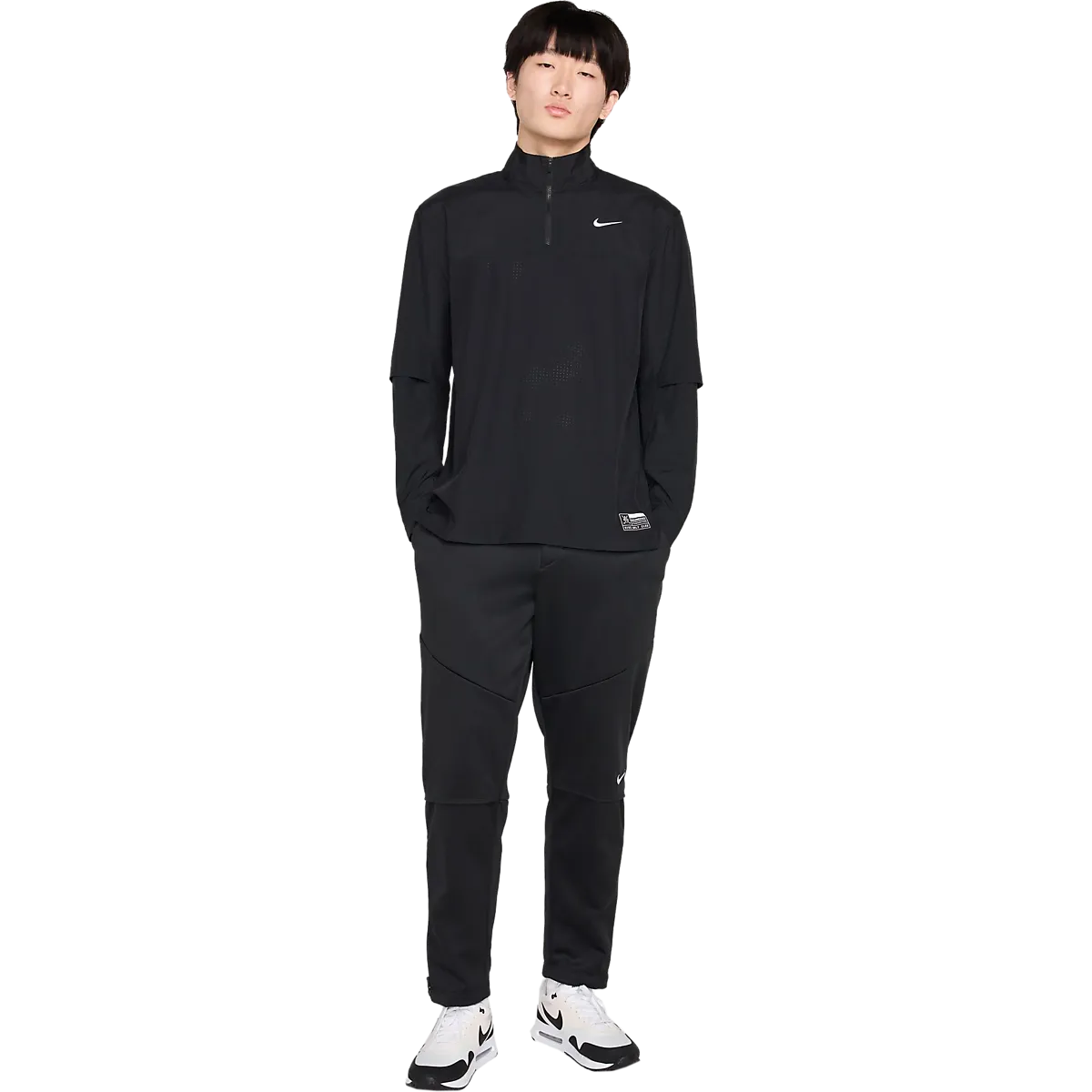 ● куртка для гольфа ● Мужские размеры S–XL. ● Свободная посадка ● Короткая молния на шее. ● Гибкий материал ● Перфорация для улучшения воздухопроницаемости. ● Сетчатая подкладка на локтях ● Впитывает влагу Dri-FIT ● 100% полиэстер Размеры: S, M, L | Цвета: Черный/Белый