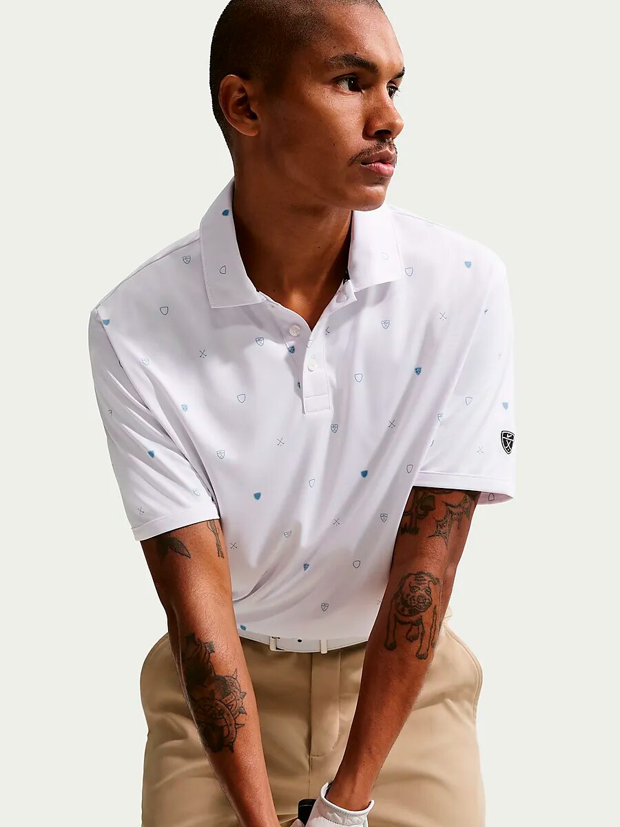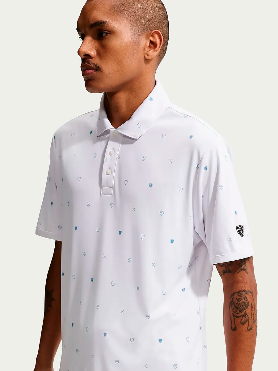 ● Шип для гольфа ● Мужские размеры ● Материал двойной вязки. ● Застежка на 3 пуговицы спереди. ● Найк Дри-ФИТ; влагоотталкивающий ● Вышитый щит Nike Golf на рукаве. ● 100% полиэстер Размеры: S, M, L, XL | Цвета: Белый/Рабочий Синий