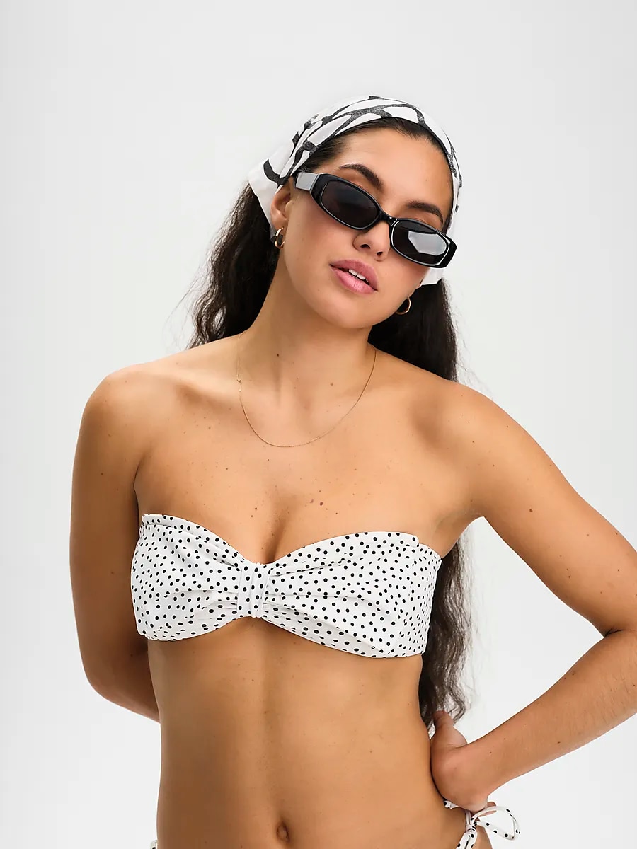 ● Верх бикини ● Женские размеры 36–42. ● Съемные бретели ● Съемные внутренние части ● Смокинг складка на спине, без застежки. Размеры: 36, 38, 40, 42 | Цвета: Черный, Кремовые точки
