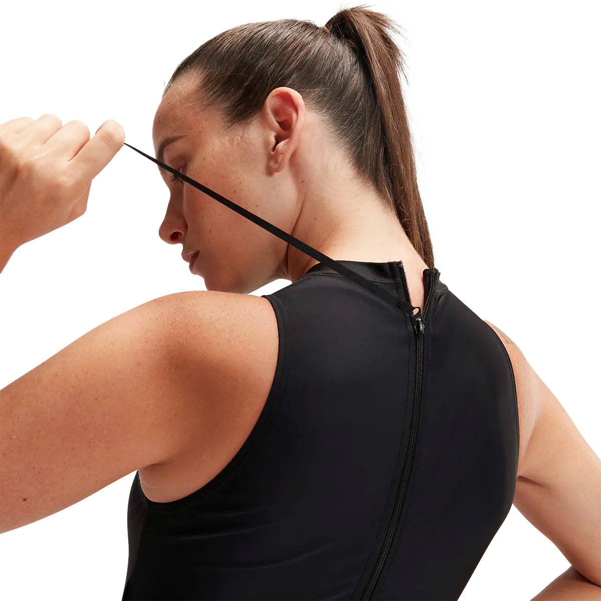 ● Высокий вырез и молния сзади.
