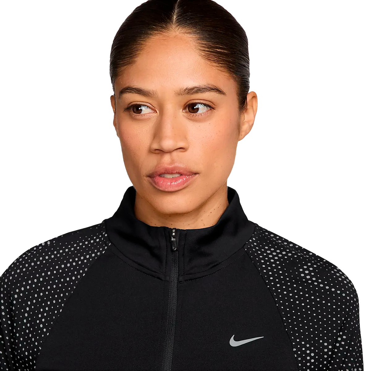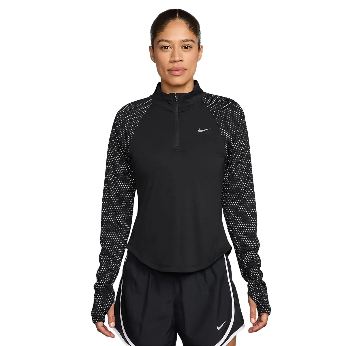 ● Беговая рубашка ● Женские размеры ● Облегает тело ● Короткая молния спереди. ● Манжеты с отверстиями для большого пальца ● Технология впитывания влаги Dri-FIT. ● 100% полиэстер Размеры: XS, S, M, L, XL | Цвета: Черный/ref Сильв