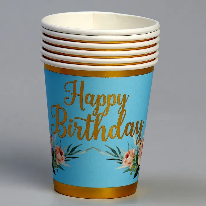 Стакан бумажный одноразовый «С днём рождения», в наборе 6 штук, голубой — Характеристики