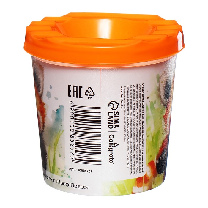 Специальная форма крышки стакана исключает возможность вытекания воды. Линия на прозрачном корпусе указывает на максимально возможный уровень наполнения. Выполнен из прочного пластика. Имеются специальные углубления на крышке для размещения кисточек. Полный объем - 210 мл. Объем до уровня - 75 мл. Оригинальный дизайн сделает процесс рисования еще более увлекательным