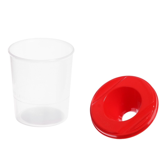 Стакан-непроливайка объемом 200 мл, указатель уровня жидкости 64 мл до уровня, при котором вода не вытекает из баночки если она опрокинется.