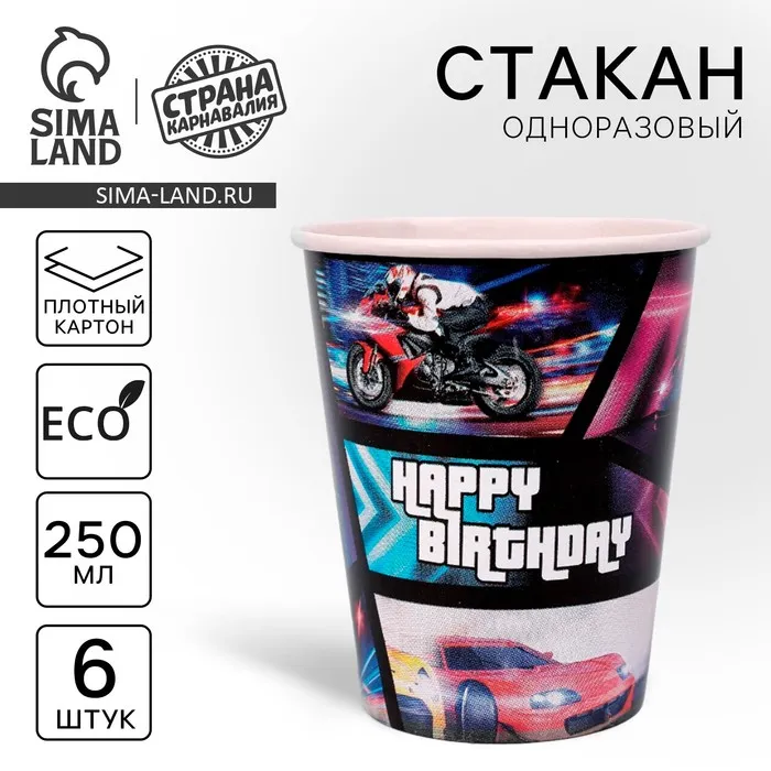 Стакан одноразовый бумажный Happy Birthday гонщик, набор 6 шт, 250 мл — Характеристики