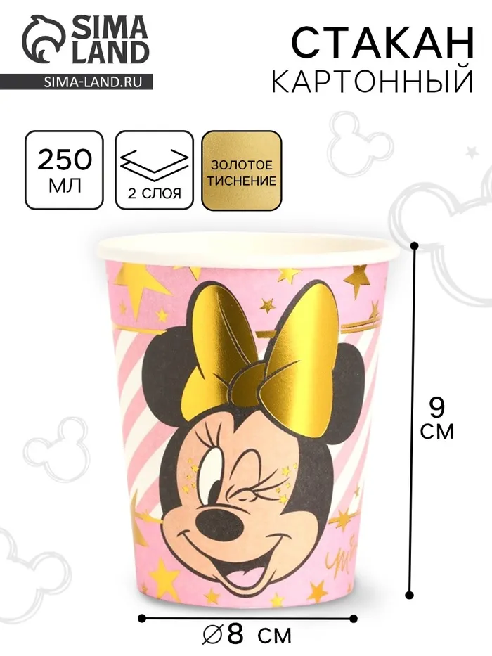 Стакан одноразовый бумажный с тиснением, 250 мл, Минни Маус