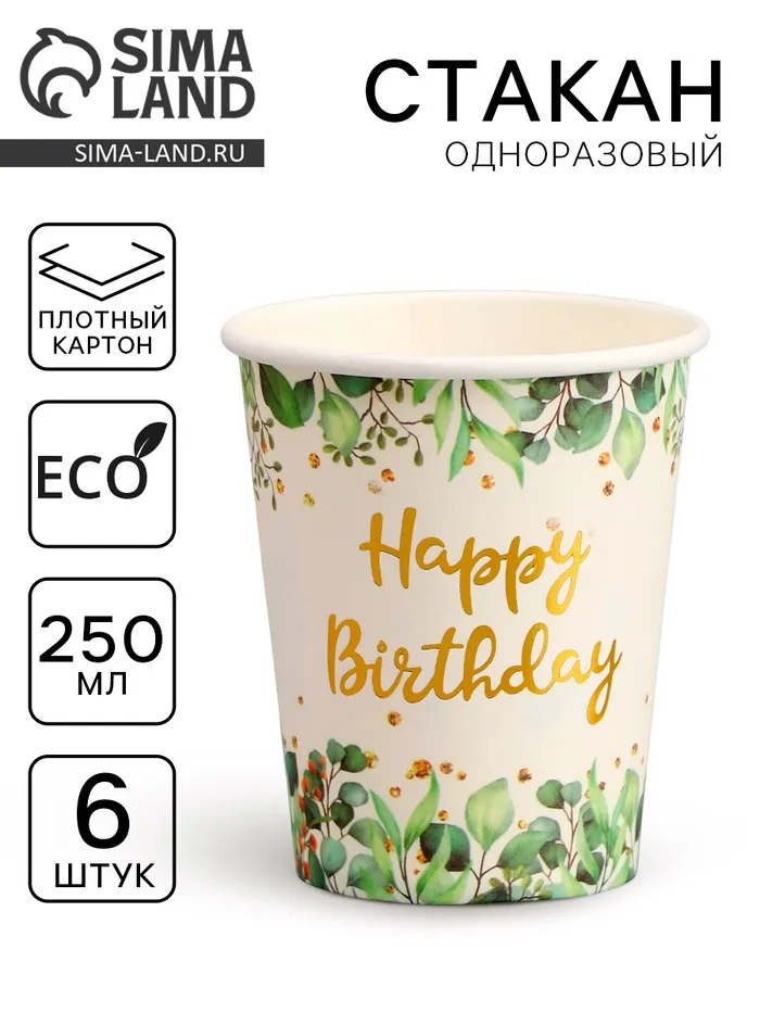 Стакан одноразовый бумажный Happy Birthday, цвет зеленый, набор 6 шт, 250 мл