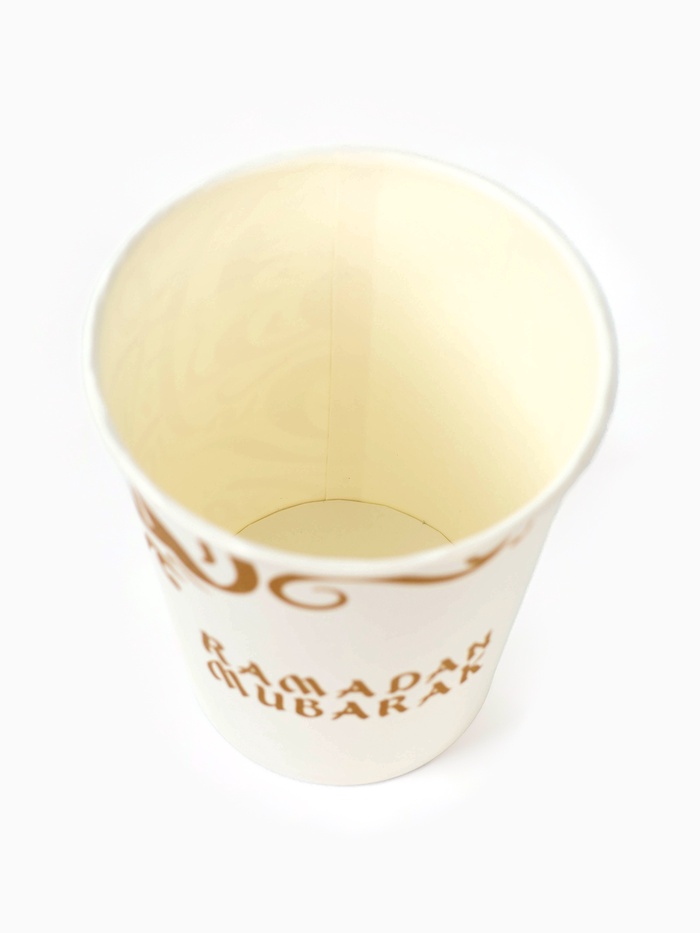 Элегантный бумажный стакан, созданный специально для месяца Рамадан. Дизайн выполнен в сдержанной бело-золотой цветовой гамме с традиционным орнаментом и надписью Ramadan Mubarak.