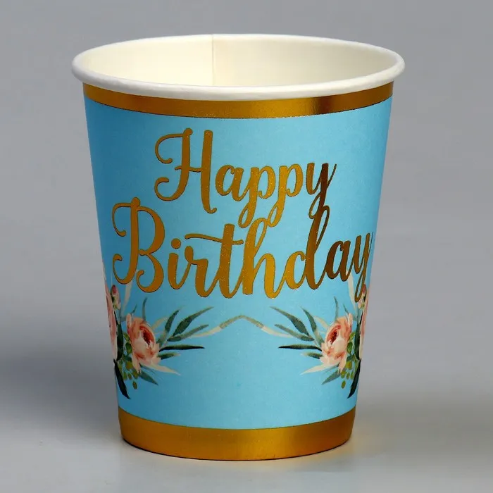 Стакан бумажный одноразовый «С днём рождения», в наборе 6 штук, голубой