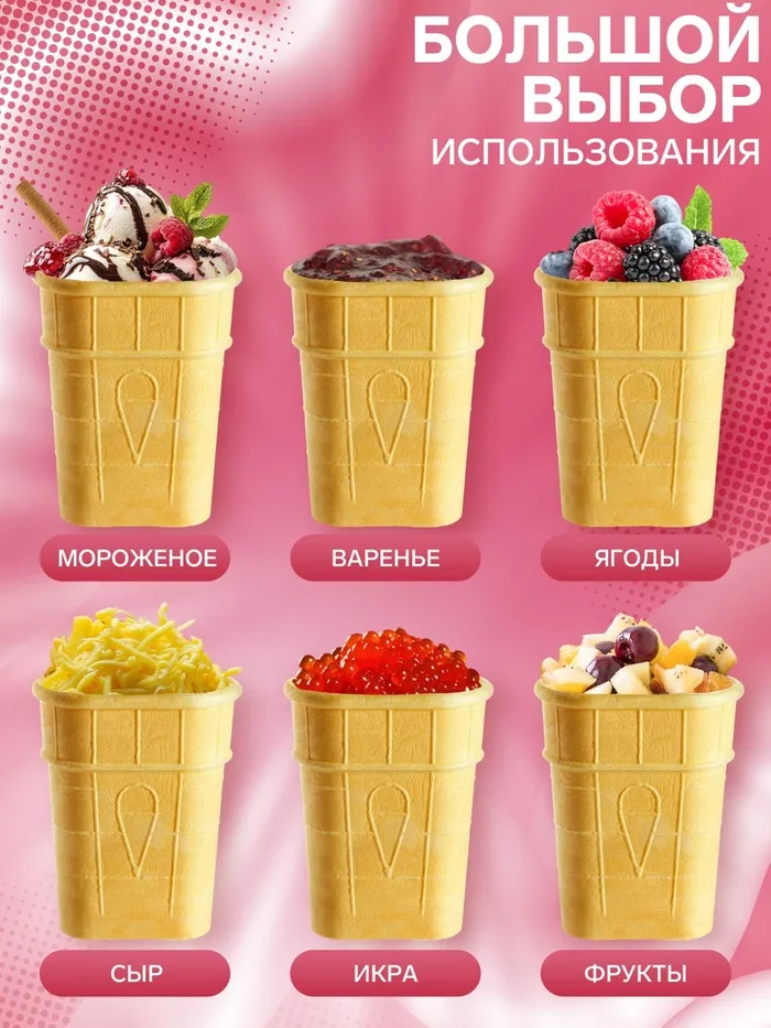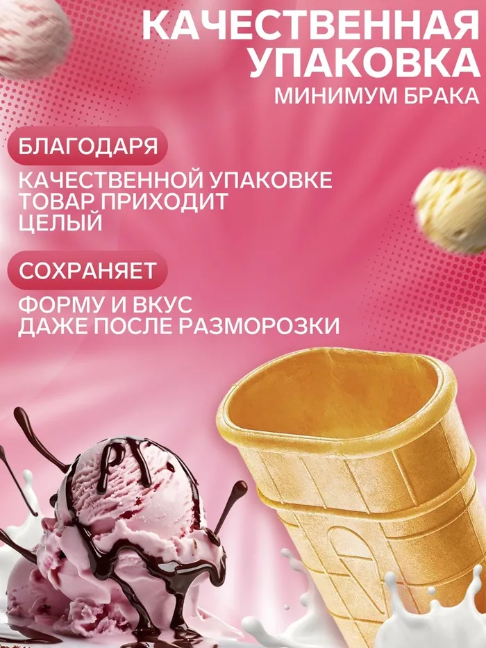 Вафельный стаканчик плоской формы. В наборе 10 хрустящих и тающих во рту стаканчиков для домашнего мороженого, а также 2 стаканчика в подарок. Вафельный стаканчик не содержит сахара. Румяная вафля с нежным ароматом выпечки не оставит вас равнодушным. Стаканчик для мороженого можно использовать для десертов, кондитерских изделий, тортов. Стаканчики поставляются в надежной упаковке.