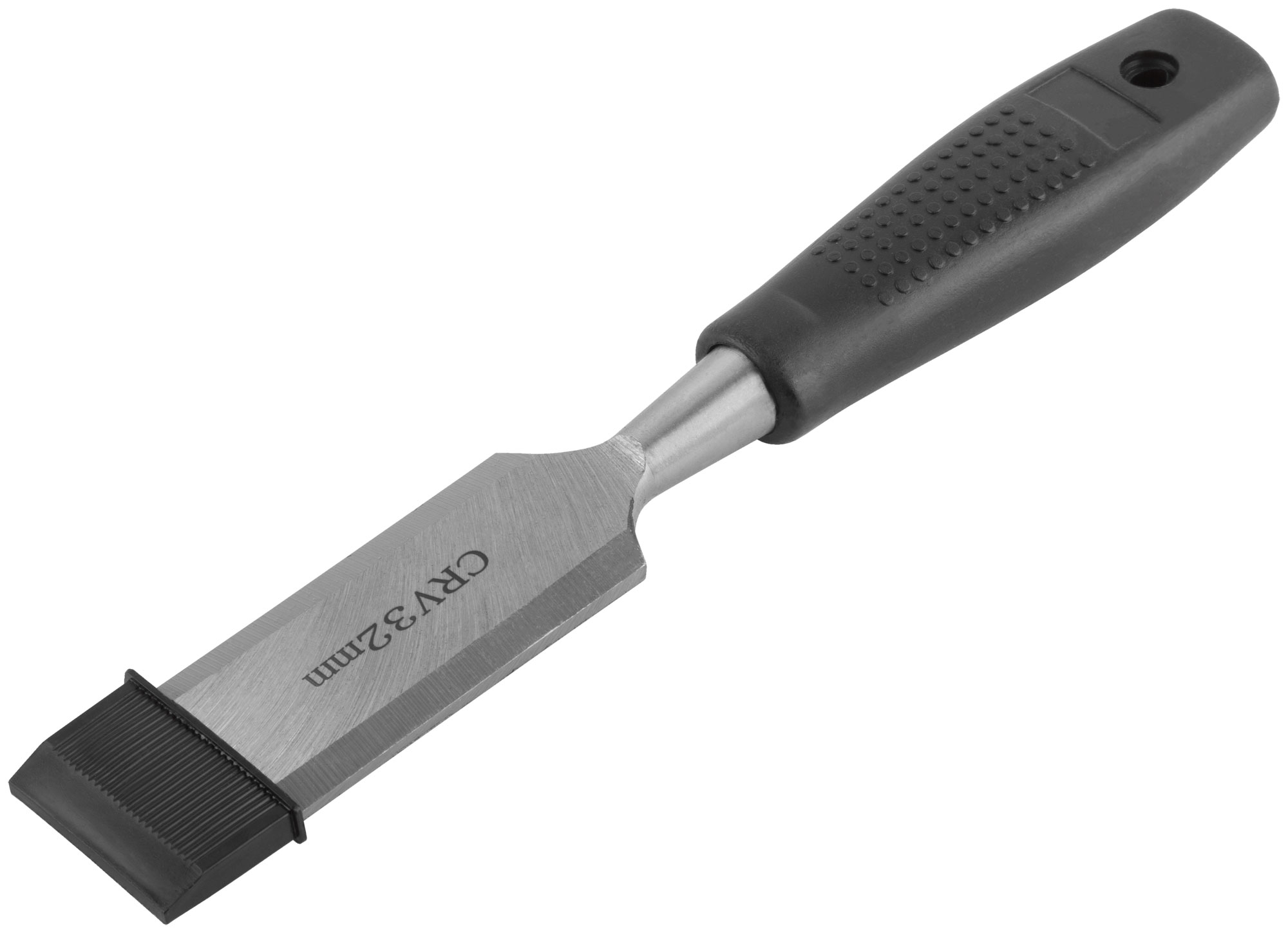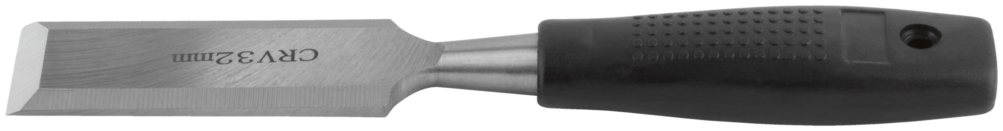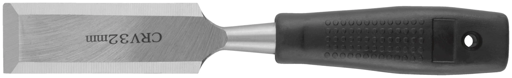 Стамеска изготовлена из инструментальной стали CrV, что обеспечивает ее долговечность и устойчивость к износу. Пластиковая ручка гарантирует удобный и надежный хват во время работы, что особенно важно при продолжительных операциях.