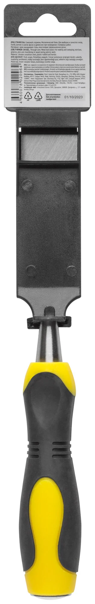 Стамеска изготовлена из термообработанной инструментальной стали, что гарантирует её долговечность и устойчивость к износу. Двухцветная прорезиненная ручка обеспечивает надежный хват, предотвращая скольжение в руке даже при длительном использовании. Встроенный металлический боек позволяет использовать инструмент для легких ударных работ.
