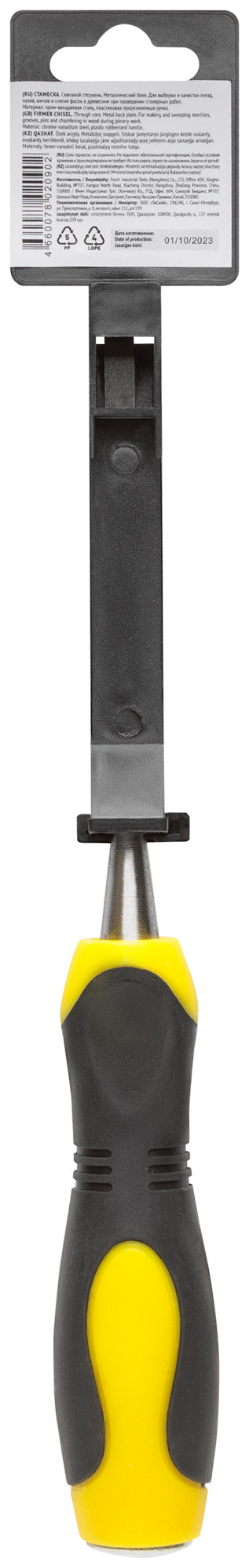 Стамеска изготовлена из термообработанной инструментальной стали, что гарантирует долговечность и надежность в эксплуатации. Двухцветная прорезиненная ручка обеспечивает комфортный захват и снижает усталость при длительной работе. Встроенный металлический боек позволяет использовать инструмент в сочетании с молотком, не повреждая рукоятку.