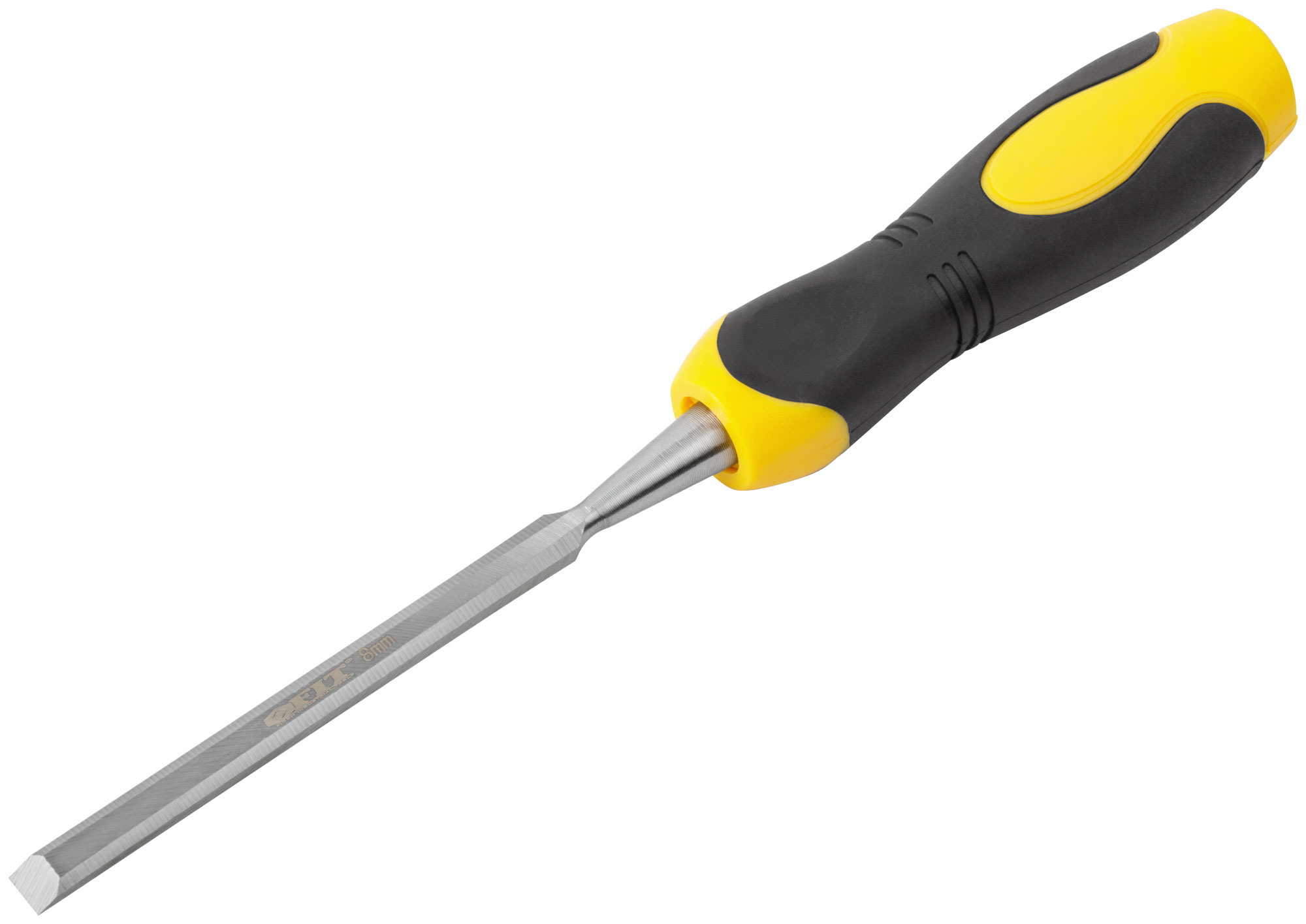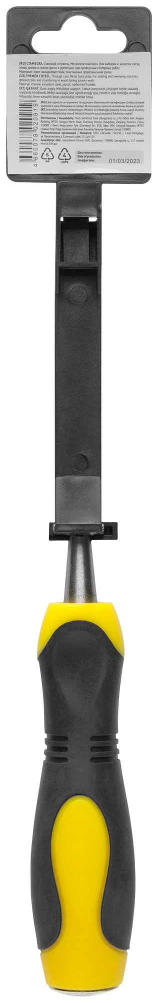 Конструкция стамески включает термообработанную инструментальную сталь, что гарантирует долгий срок службы и стойкость к износу. Двухцветная прорезиненная ручка обеспечивает комфортный и надежный хват, снижая утомляемость рук даже при продолжительной работе. Встроенный металлический боек позволяет использовать инструмент с молотком без риска повреждений.