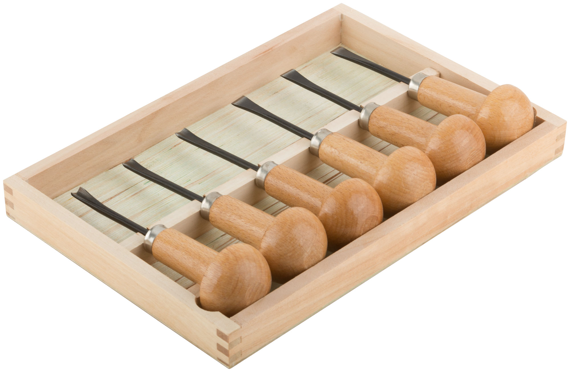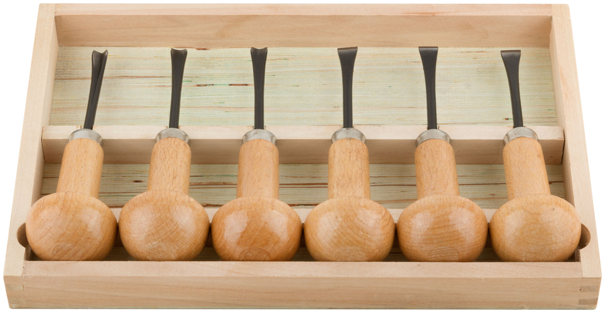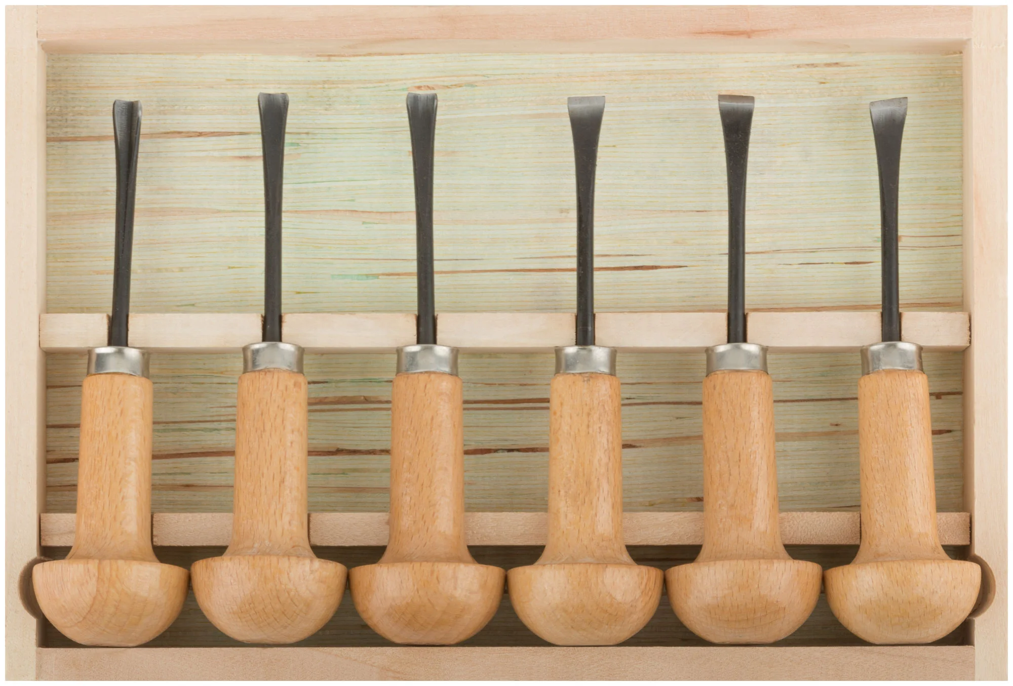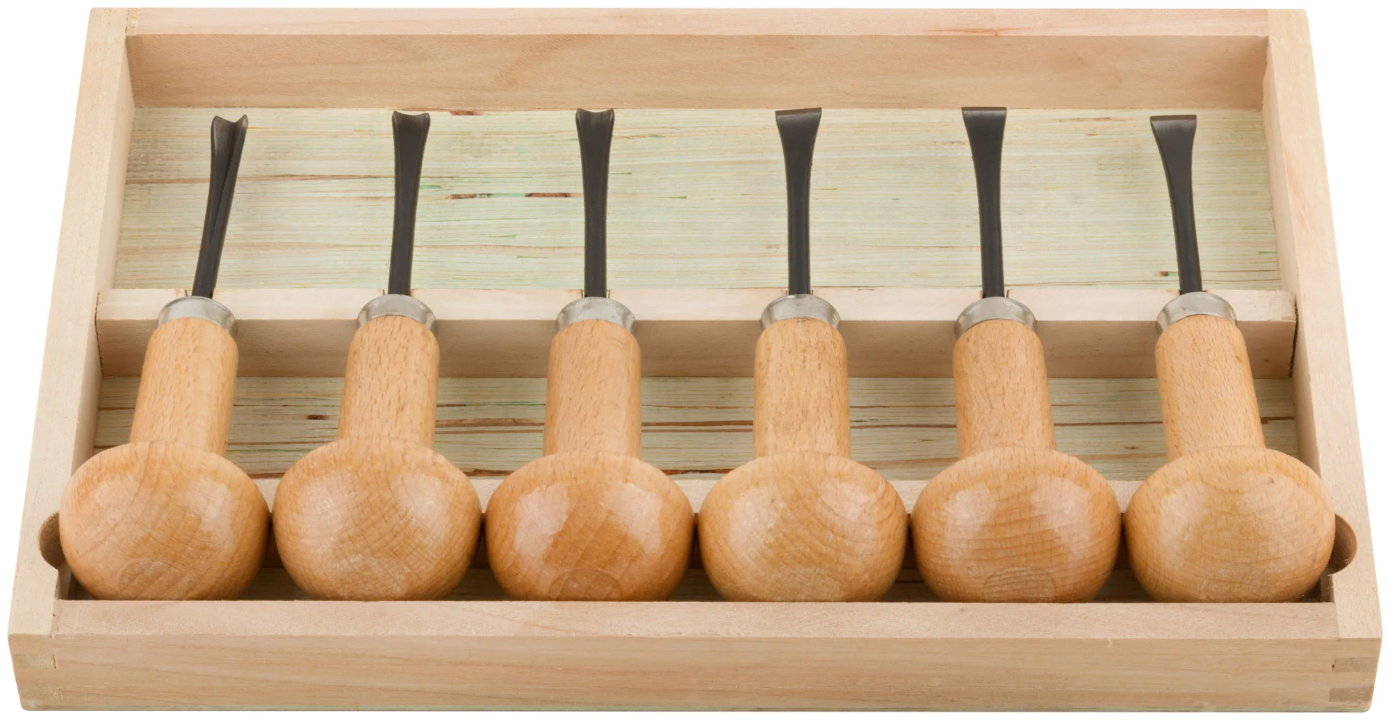 Преимущества набора включают разнообразие форм резцов, что расширяет возможности мастера. В комплект входят косой резец 9 мм, прямой резец 10 мм, полукруглый резец 8,5 мм, V-образный резец 7 мм, изогнутый полукруглый резец 8 мм и изогнутый прямой резец 11 мм.