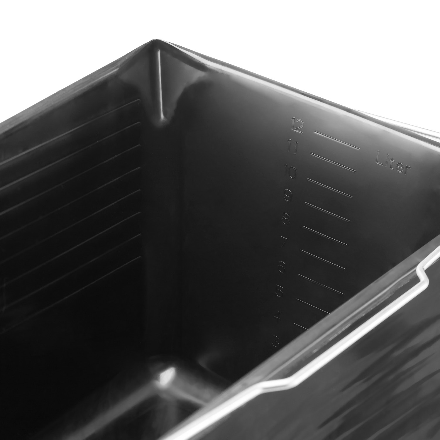 Форма ведра удобна для работы малярным валиком, специальный рельеф на стенке ведра позволит равномерно распределить краску или лак по поверхности валика, а градуировка на стенке повышает точность подбора цвета при смешивании лакокрасочных материалов. Имеет оцинкованную рукоятку и удобный носик для слива.
