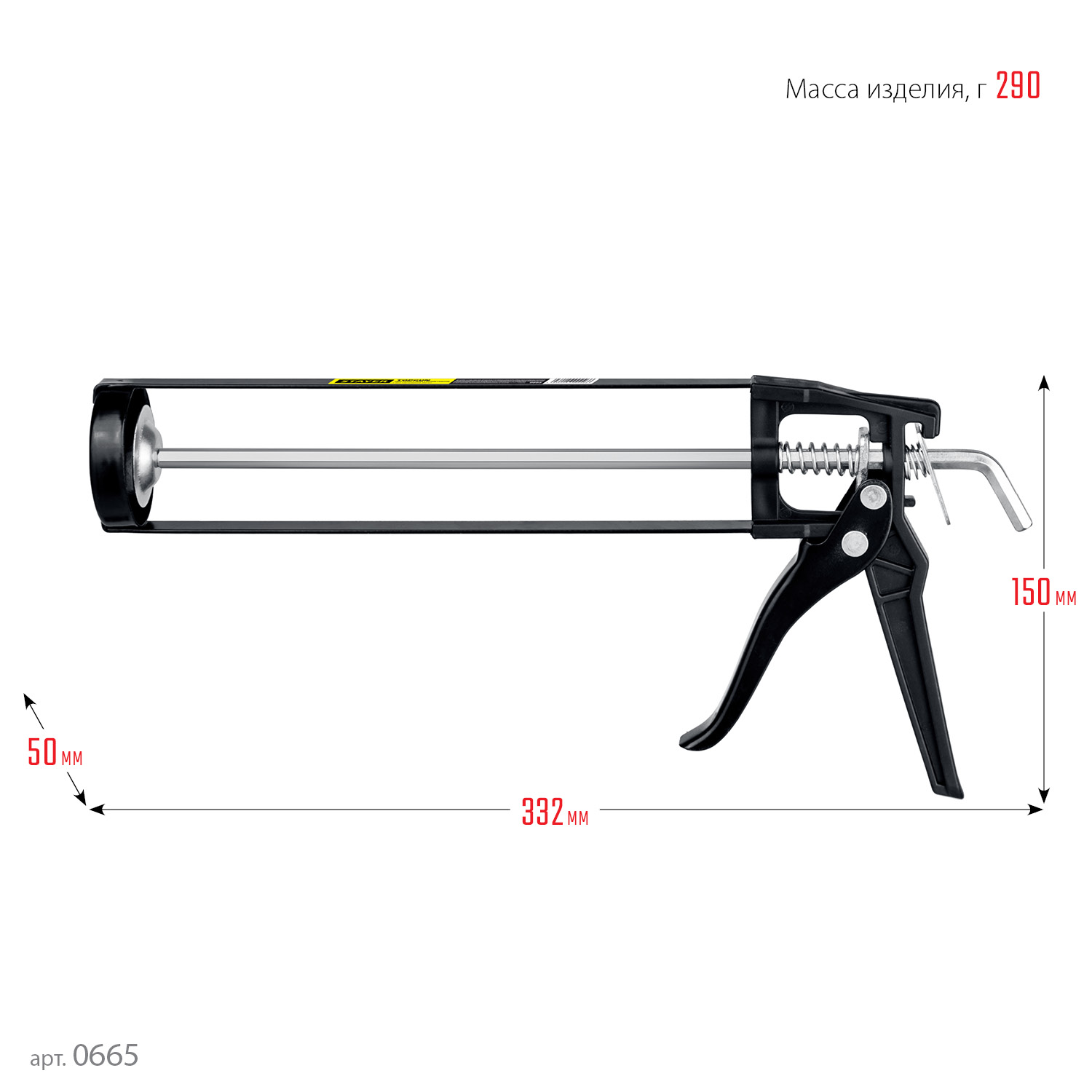 Пистолет для герметиков подходит для работы с картриджами объемом 310 мл, имеет скелетную конструкцию и ручку из ударопрочного пластика которые способствуют равномерной подачи клея либо герметика. Данная спецификация обеспечивает прочность и надежность конструкции пистолета при использовании.
