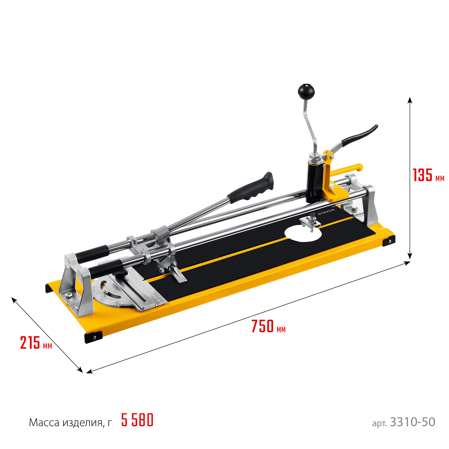 Плиткорез STAYER - правильный выбор! Оснащен сменным твердосплавным режущим элементом, . Металлические направляющие обеспечивают точный и плавный разрез керамической плитки. Усиленная платформа и опоры позволяют проводить работы с керамической плиткой повышенной толщины и увеличивают срок службы плиткореза.