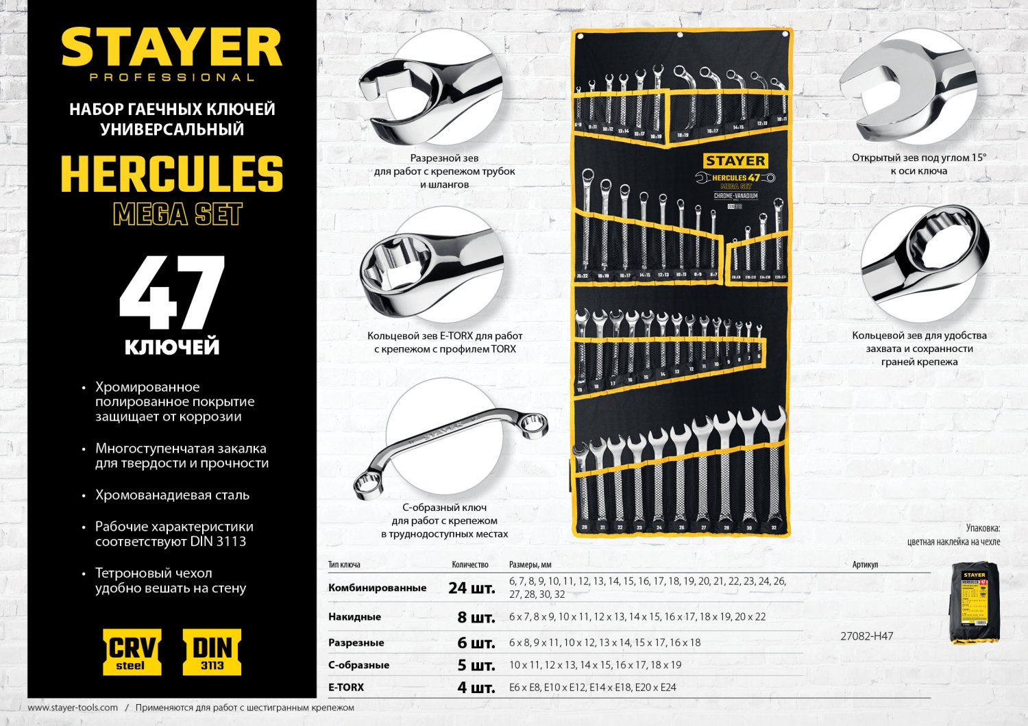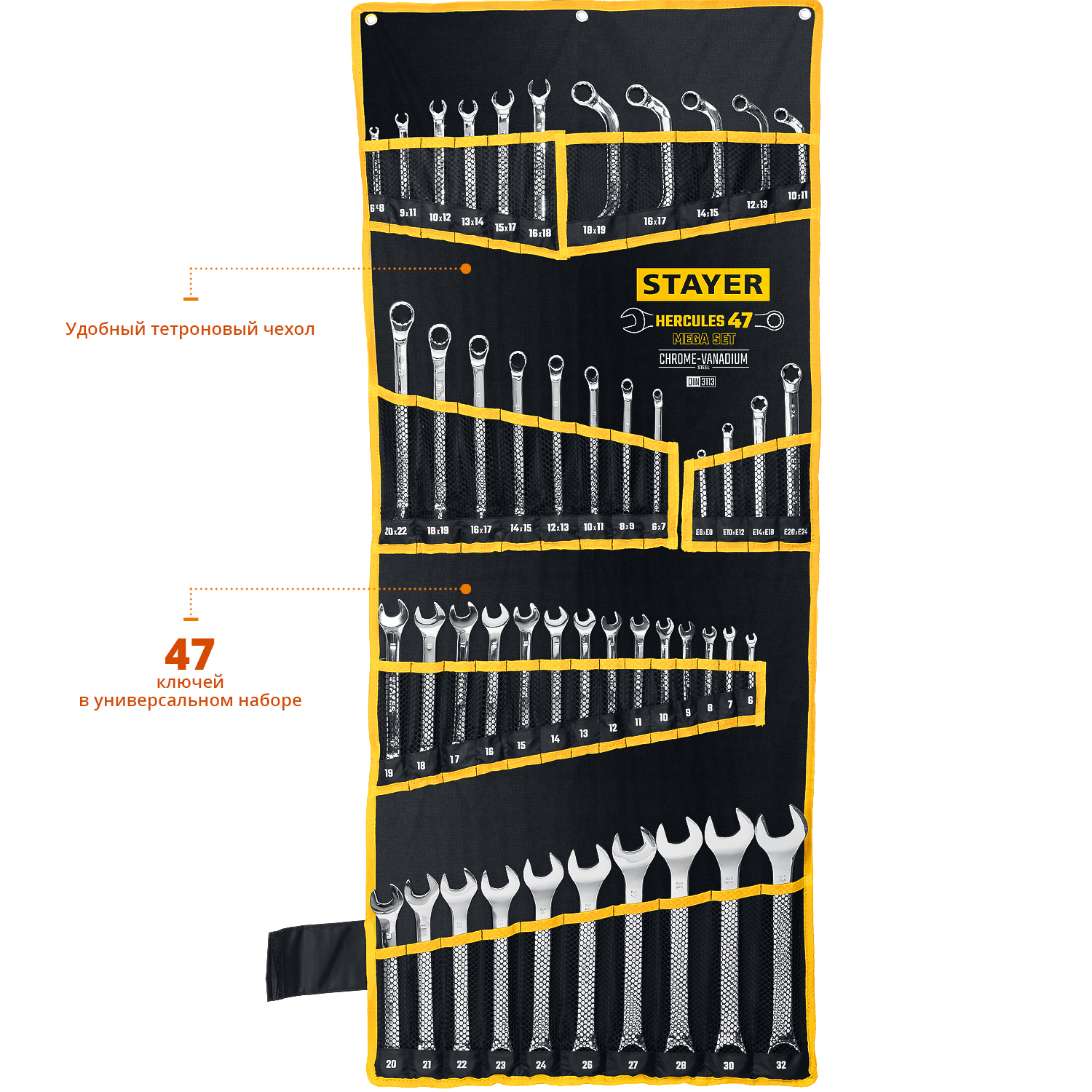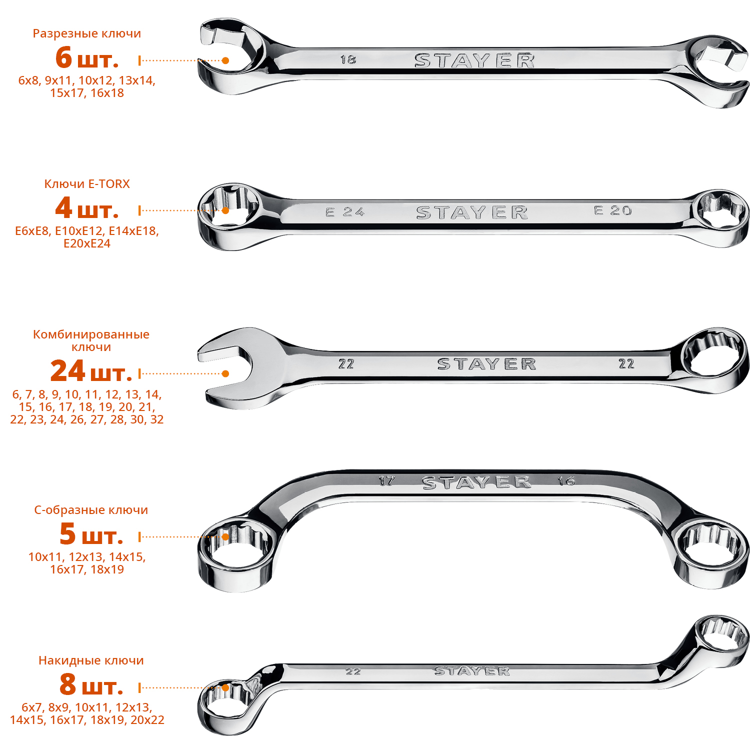 Комплектация: 47 шт. комбинированные 24 шт: 6, 7, 8, 9, 10, 11, 12, 13, 14, 15, 16, 17, 18, 19, 20, 21, 22, 23, 24, 26, 27, 28, 30, 32 мм накидные 8 шт: 6х7, 8х9, 1