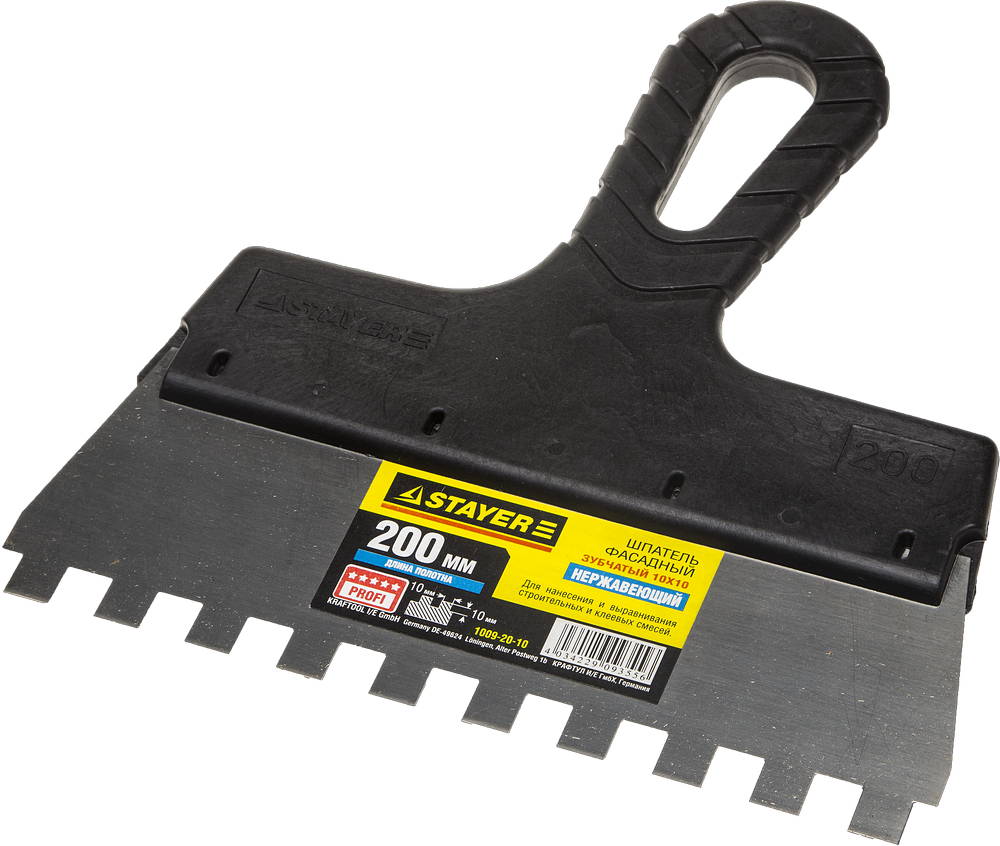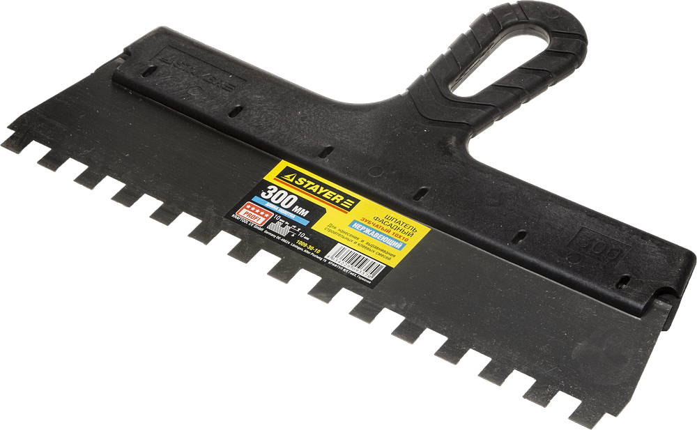 Благодаря зубчатой кромке шпатель идеально подходит для работы со строительными и клеевыми смесями, полотно из нержавеющей стали обеспечивает надежность и долгий срок службы, а удобная пластмассовая рукоятка создает условия для комфортной работы