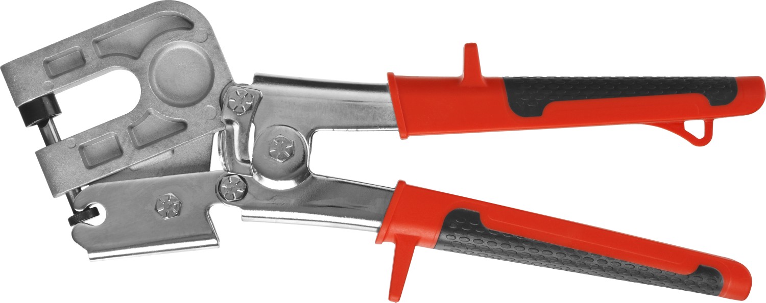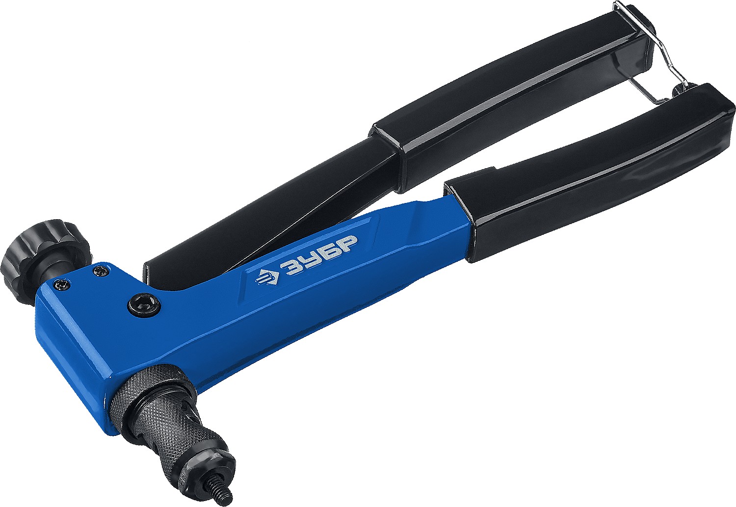 Применяется для установки стальных и алюминиевых вытяжных заклепок. Способ применения 1. Просверлите сквозное отверстие в скрепляемых материалах. 2. Установите заклепку в просверленное отверстие. 3. Раздвиньте ручки заклепочника, вставьте стержень в отверстие головки. 4. Сжимайте и разжимайте рукоятки заклепочника до момента отламывания стержня.
