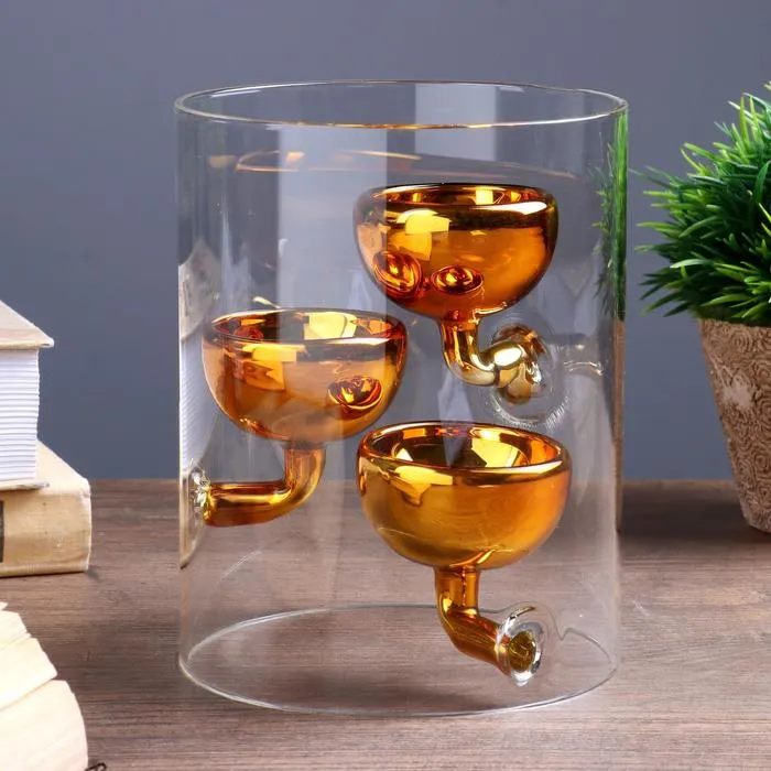 Стеклянный подсвечник на 3 свечи «Цилиндр с чашами», прозрачный с золотом, 15×11.8×11.8 см — Характеристики