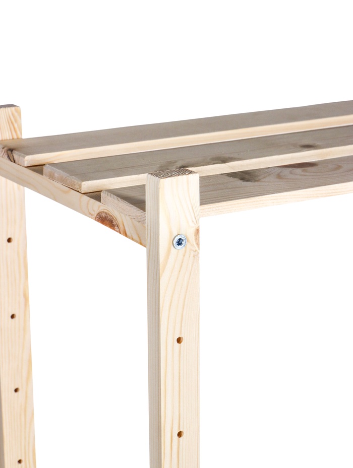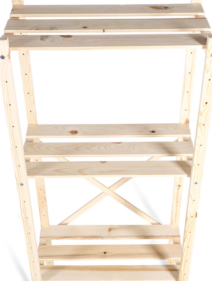 - Прочная конструкция из дерева: каркас и полки изготовлены из натурального дерева. Материал обеспечивает стабильность и долговечность, выдерживая значительный вес.