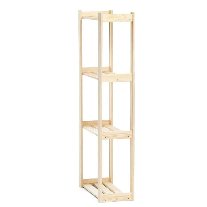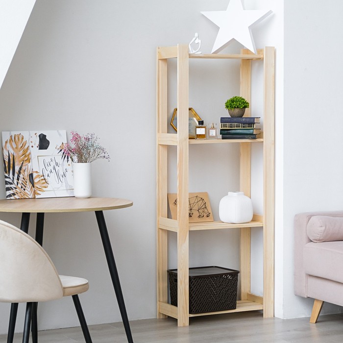Открытый компактный стеллаж, сделанный из массива хвои, самый бюджетный в нашей серии. Он станет полезной частью гостиной, спальни, детской комнаты, квартиры-студии или офисных помещений.