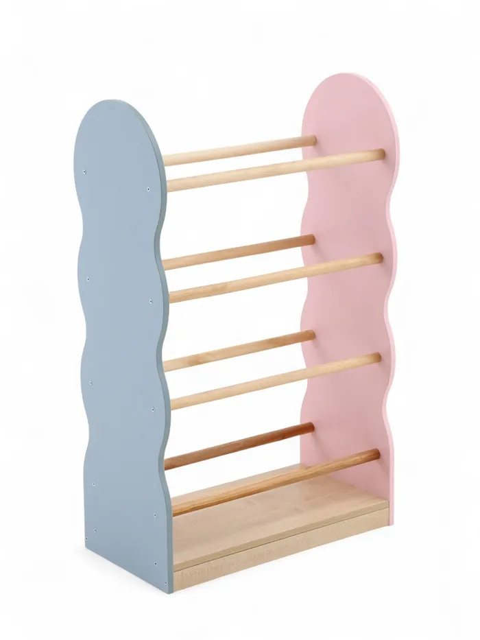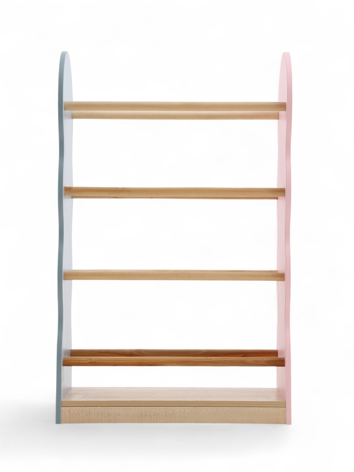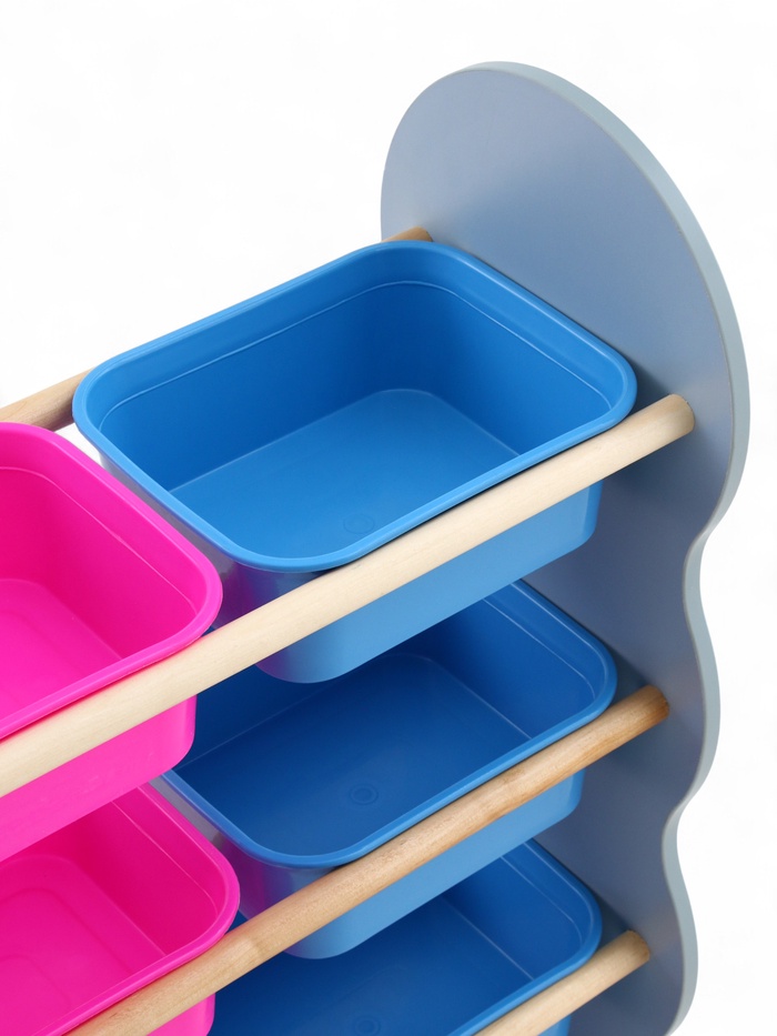 Предназначен для хранения детских игрушек и сменных вещей. Конструкция включает четыре открытые полки со съёмными пластиковыми ящиками. Светлое цветовое оформление делает изделие подходящим для интерьеров детских садов и игровых комнат. Конструкция безопасна для детей: устойчива и не имеет острых углов.
