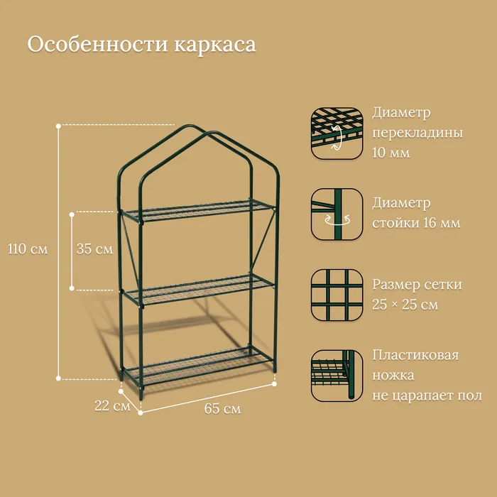 Стеллаж для рассады, 3 полки, 110 × 65 × 22 см, металлический каркас d = 16 мм, без чехла — Характеристики