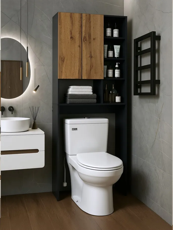 • Над унитазом: удобное размещение бумаги, полотенец, средств для уборки