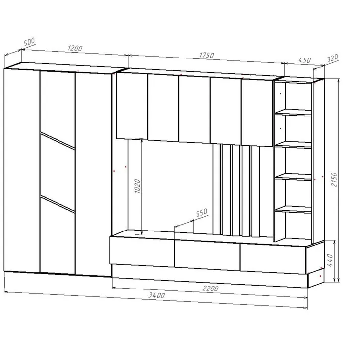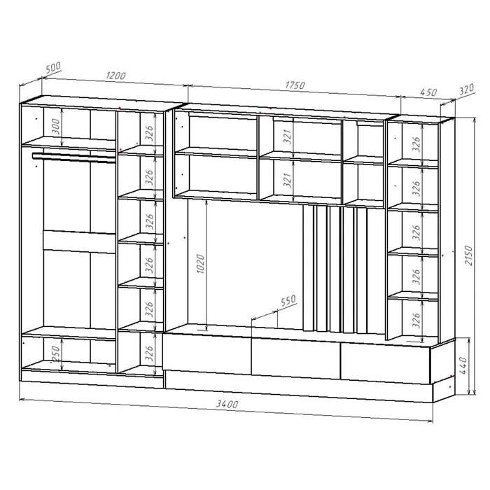 - Тумба под ТВ. Размер ниши для телевизора: 1750х1020х550.