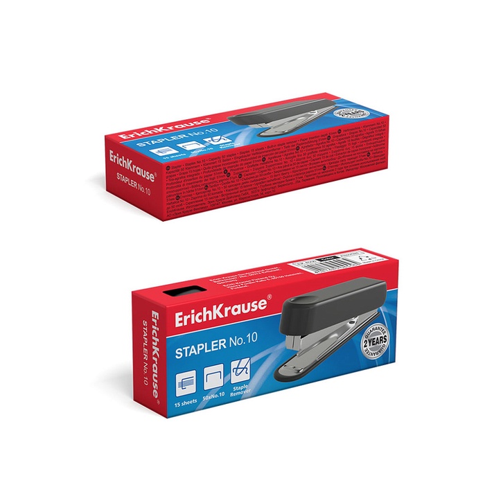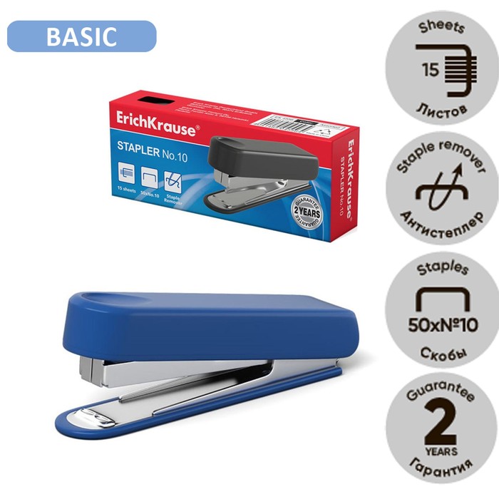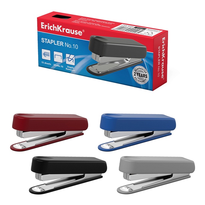 Степлер канцелярский № 10 ErichKrause, до 15 листов, встроенный антистеплер, МИКС — Характеристики