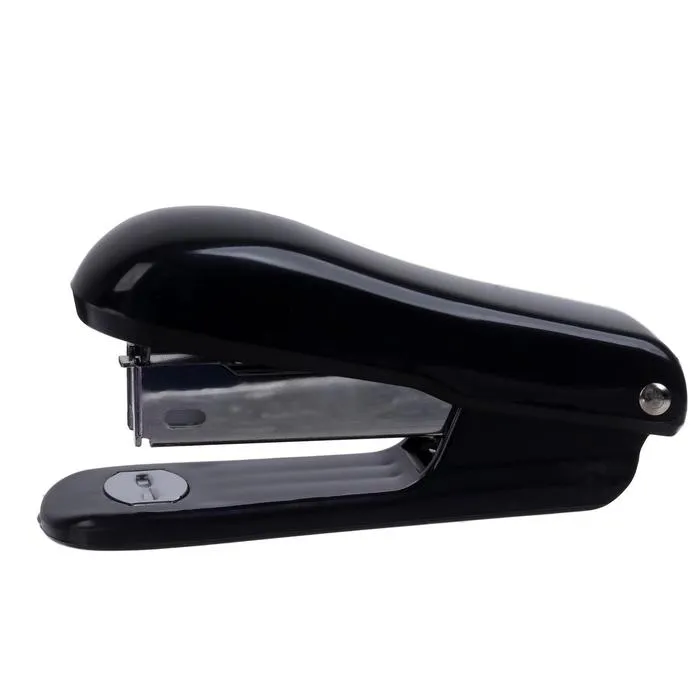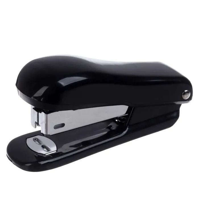 Канцелярский степлер №24/6в чёрном цвете обеспечивает сквозное закрепление листов бумаги (до 20) скобами с последующим загибание их хвостиков. Состав: металл, пластик.
